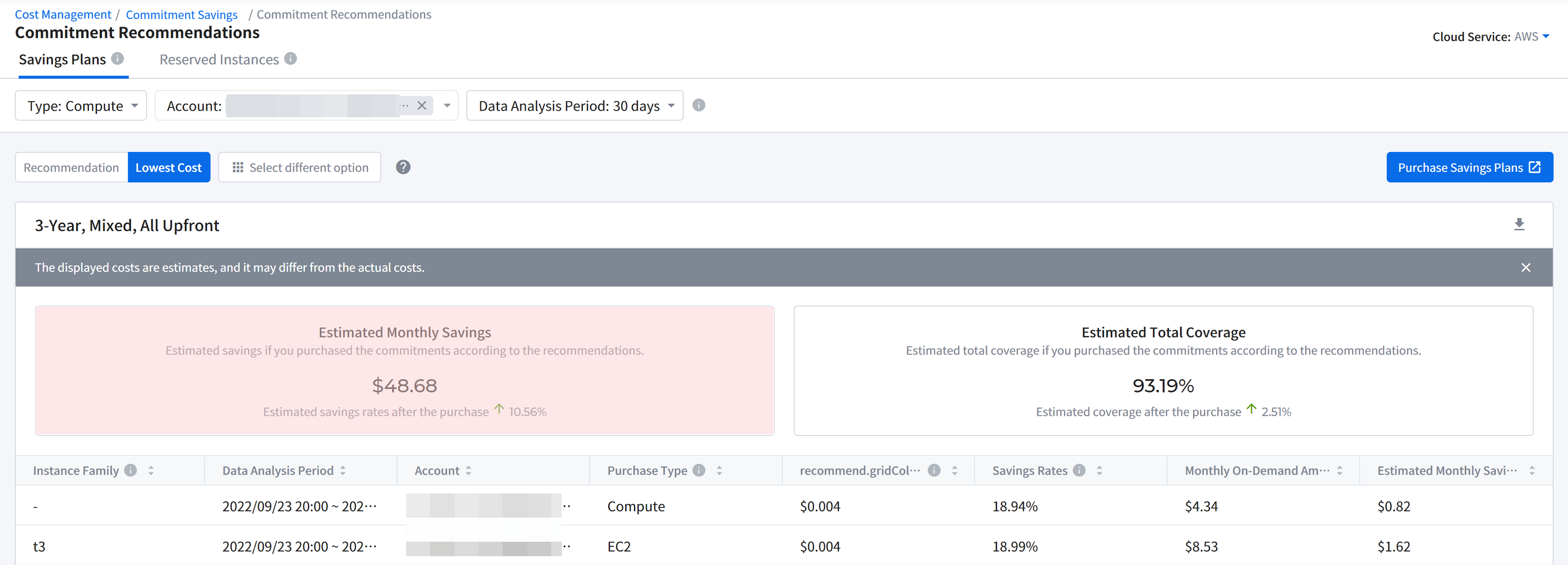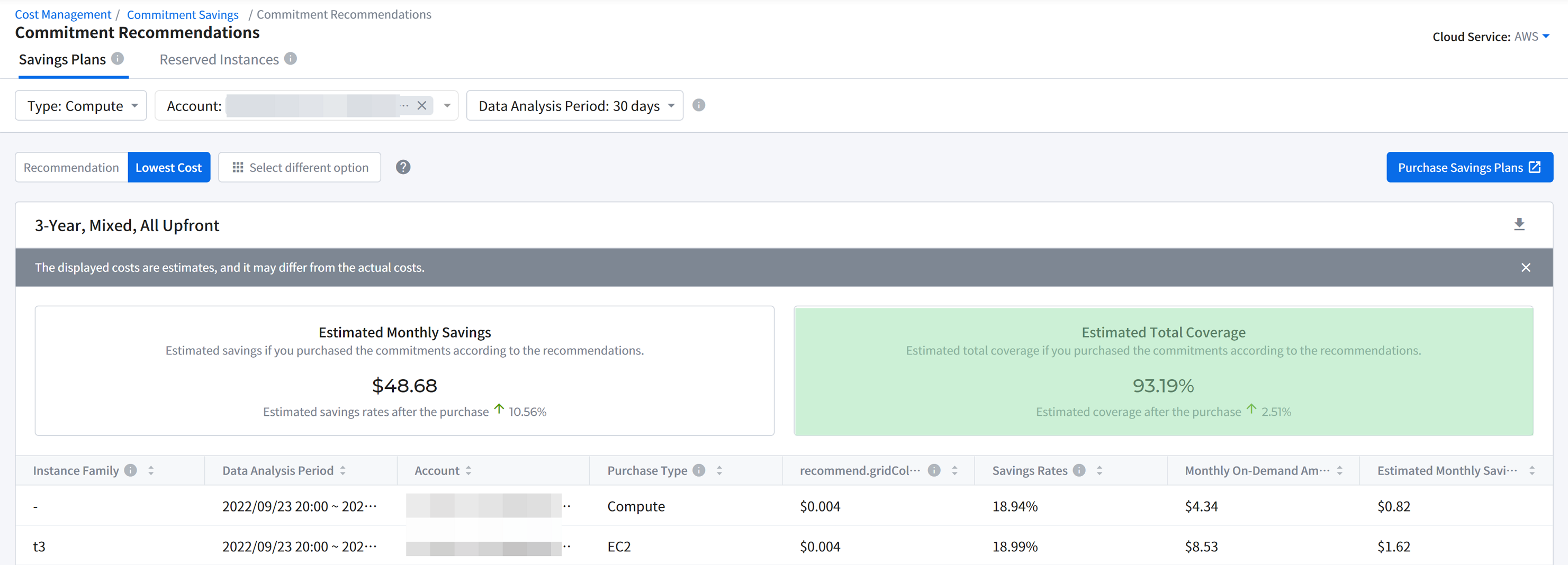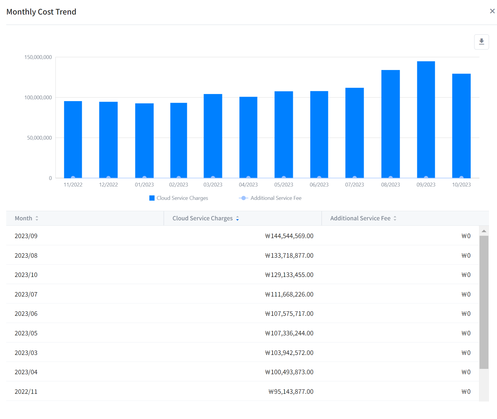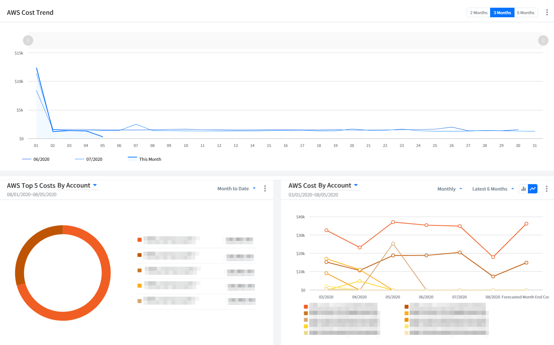 It displays the trend of cloud cost. You can set a period to 2 months, 3 months, or 6 months to see the trend. If you move your mouse over the graph, a pop-up window will appear to show monthly cost information for the selected time period.