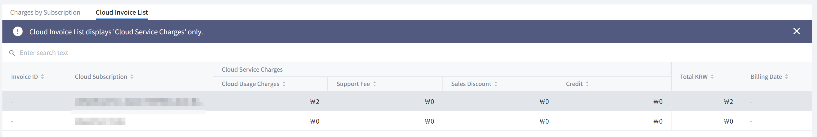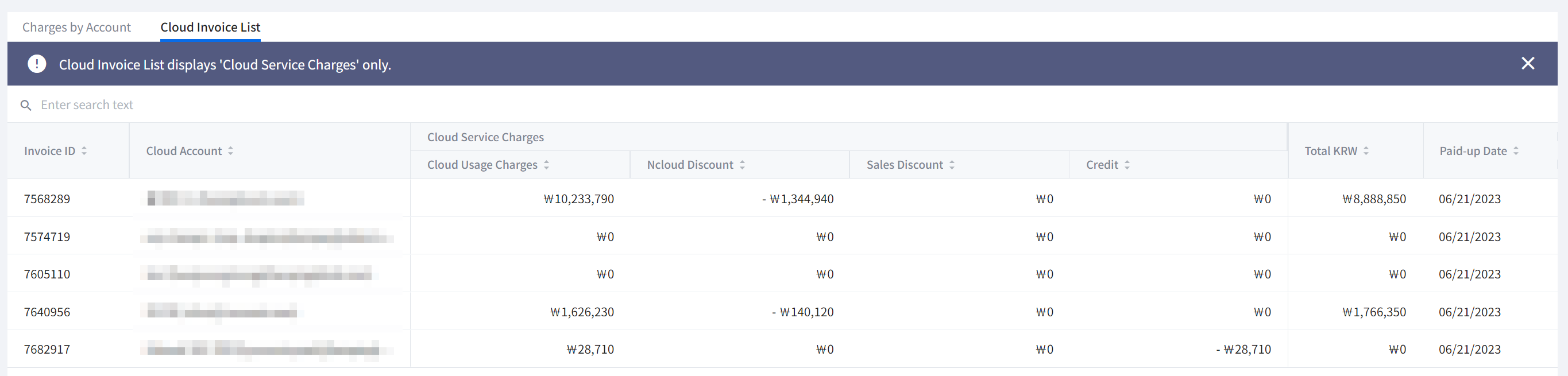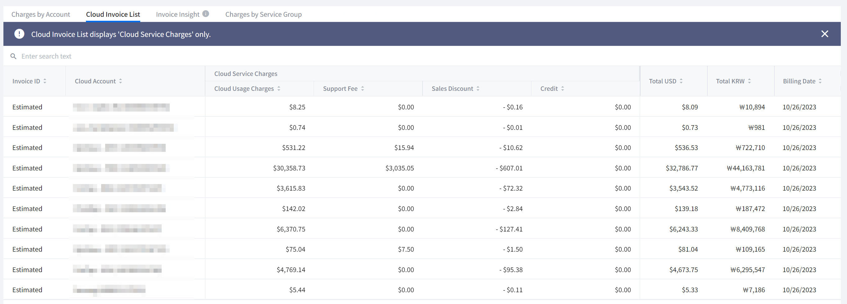 View total costs of your cloud service, and costs by account, invoice, and additional service. To learn more about billing details, see Billing.
