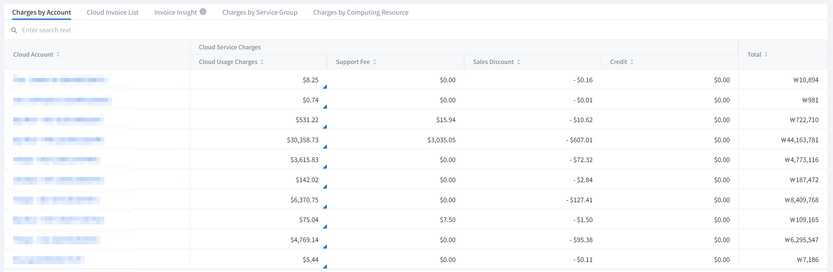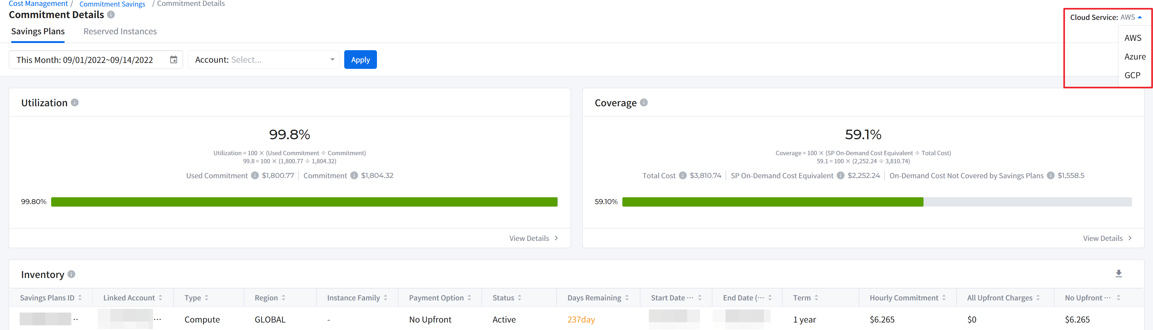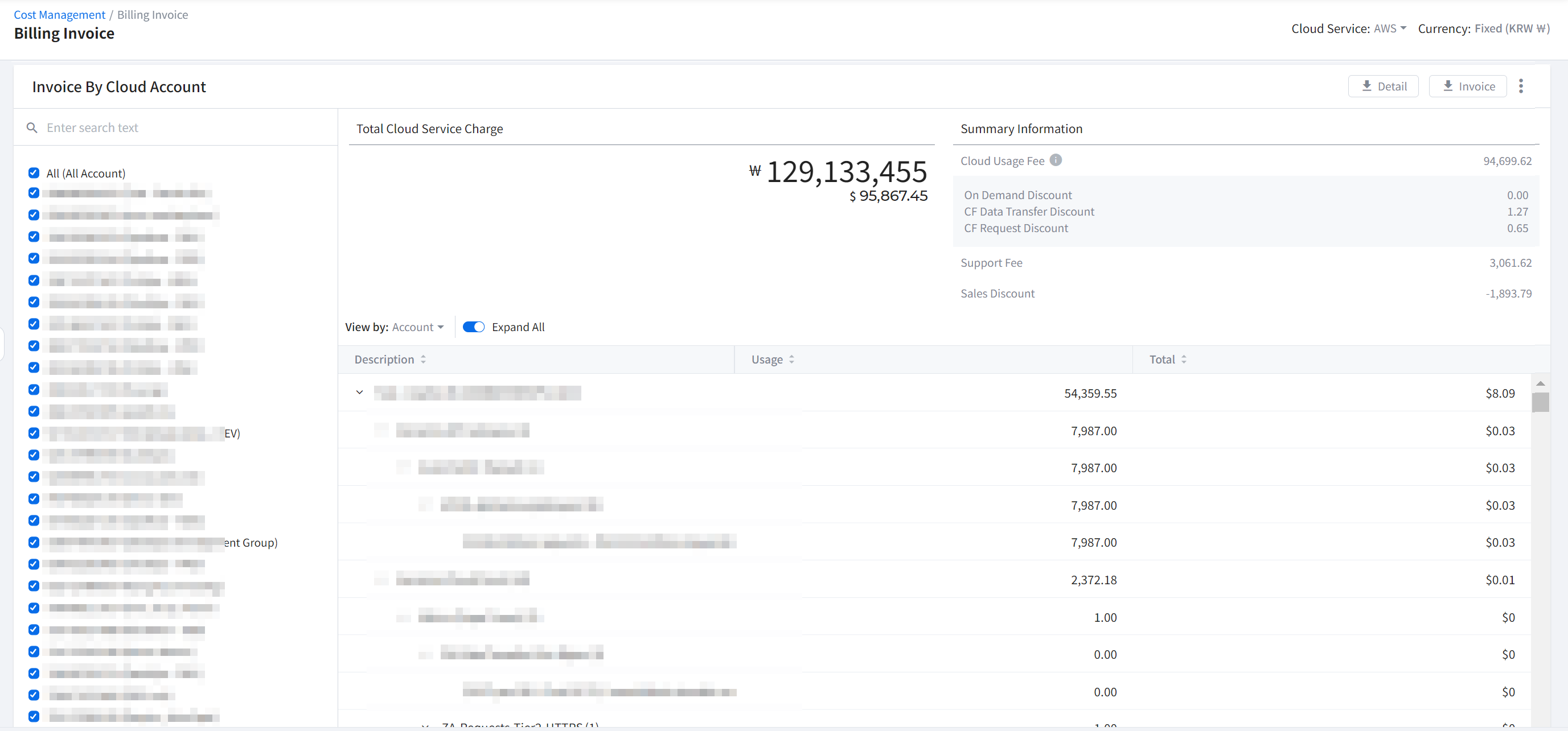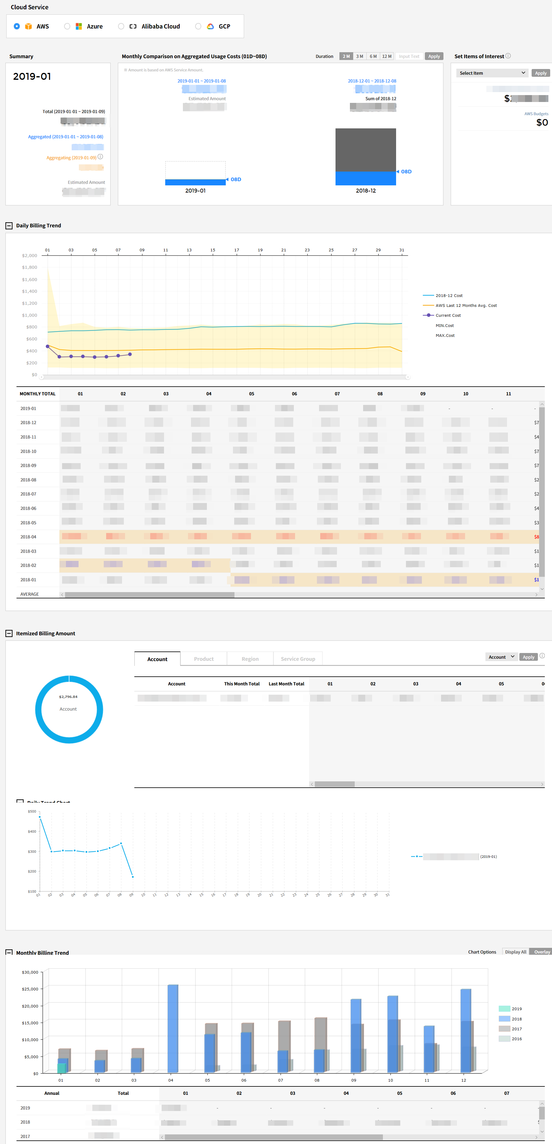 It displays your cloud services and accounts. As you select a cloud service and account, detailed cost information of the selected items will be displayed in various formats on the dashboard.
