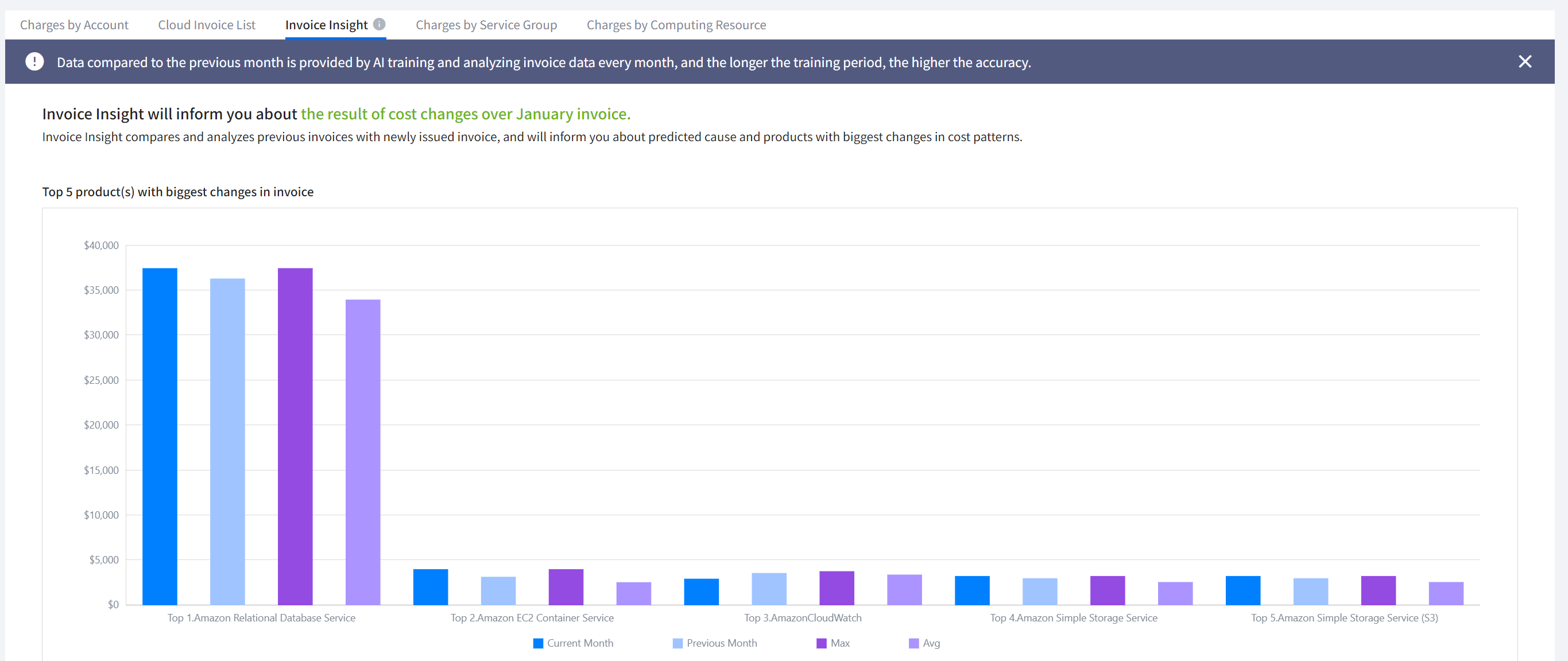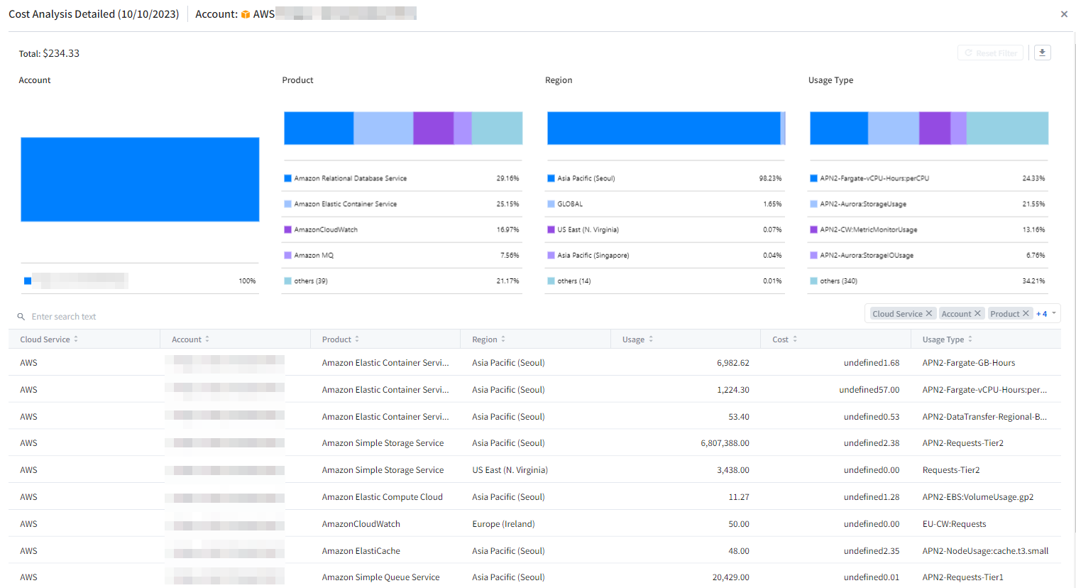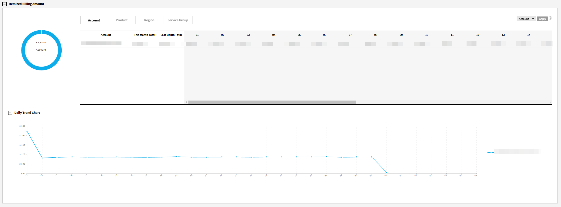 You can check costs based on Account, Product, Region and Service Group, and also view daily trend charts for itemized costs.