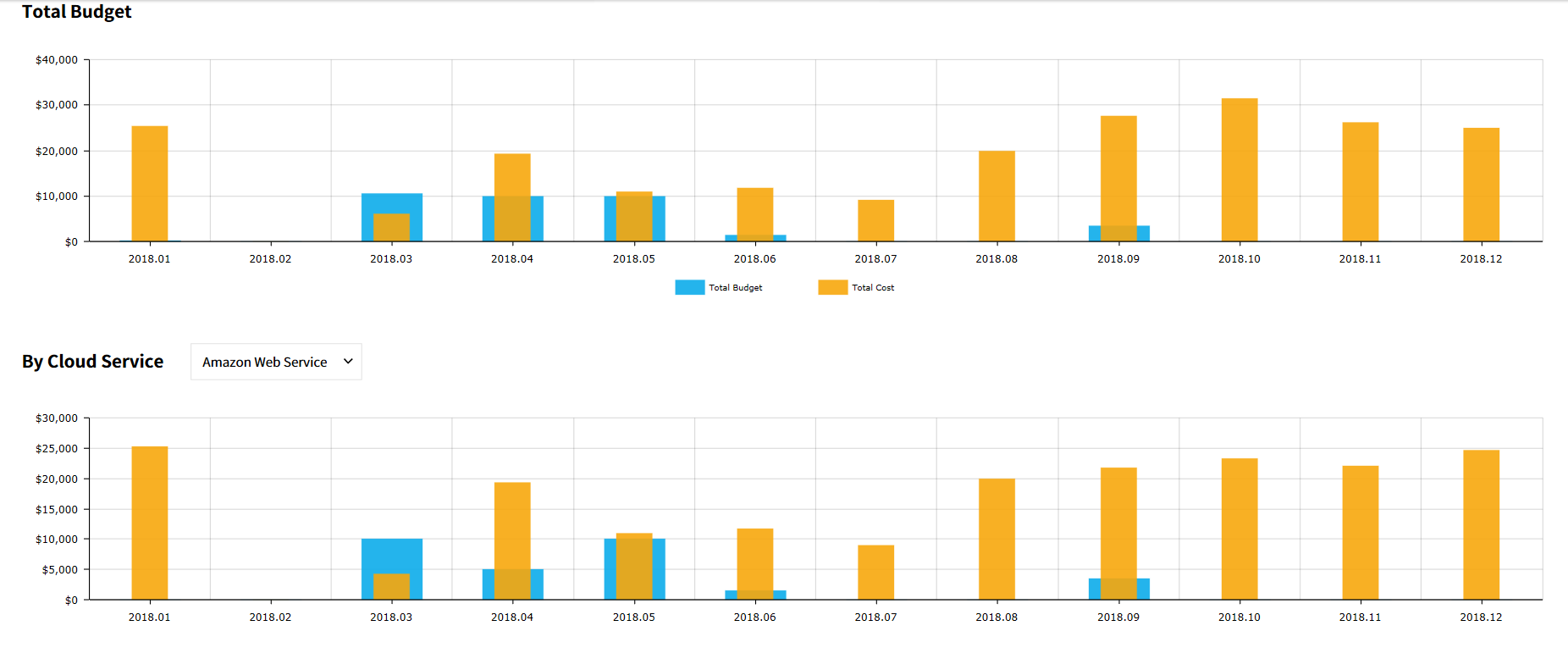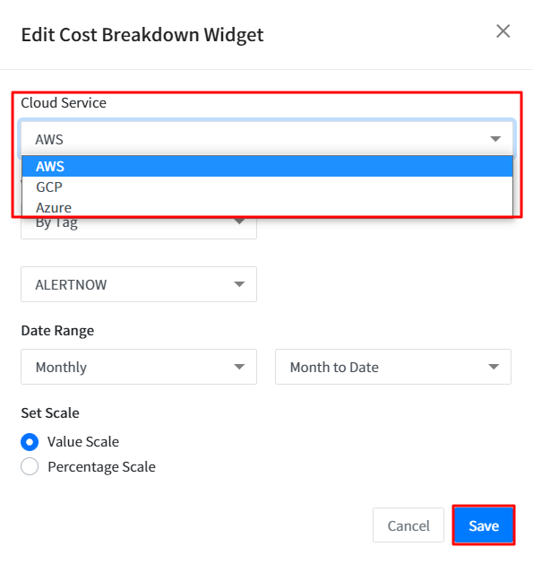 If you are using more than one Cloud Service, select multiple Cloud Services in this single widget to view the integrated cost breakdown in the bar chart.