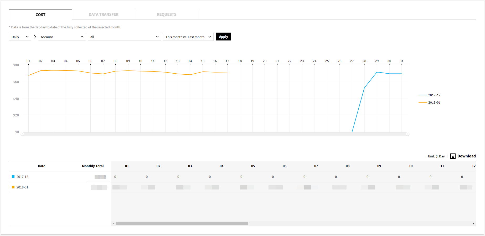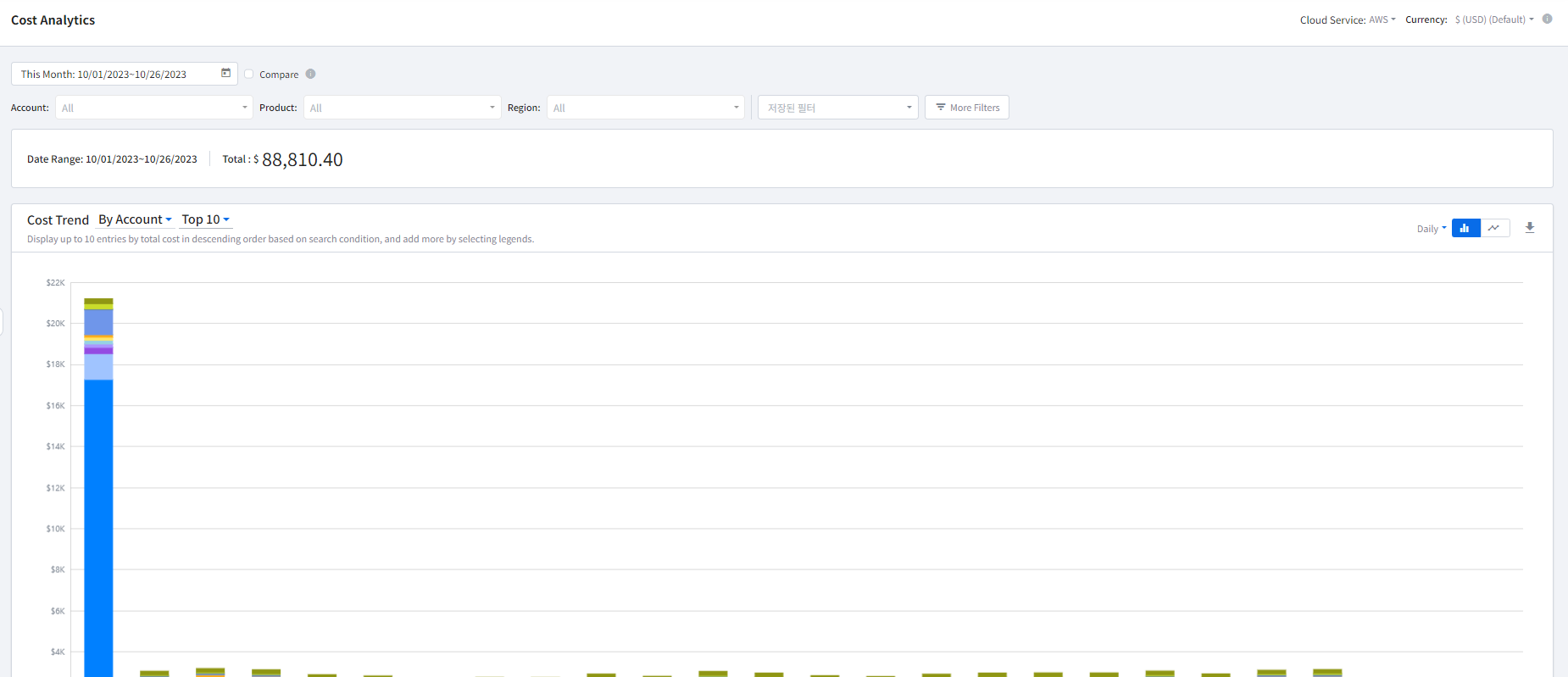 Daily Cost Trend provides you the cost chart and detailed data for a selected period on a daily basis. With the chart, you can check daily usage patterns and a point where unexpected costs incurred.