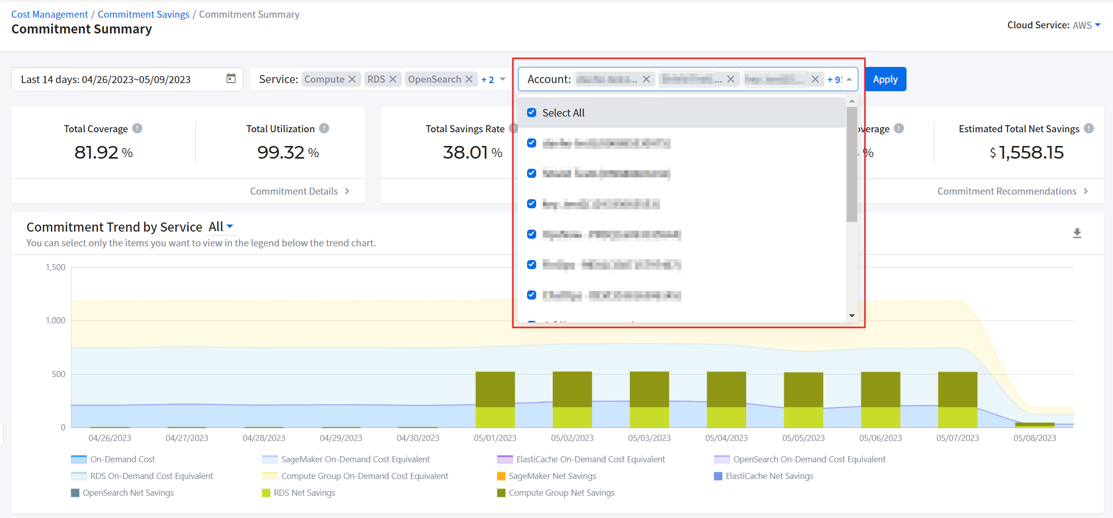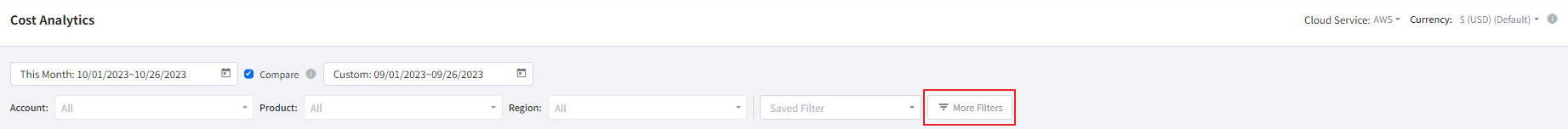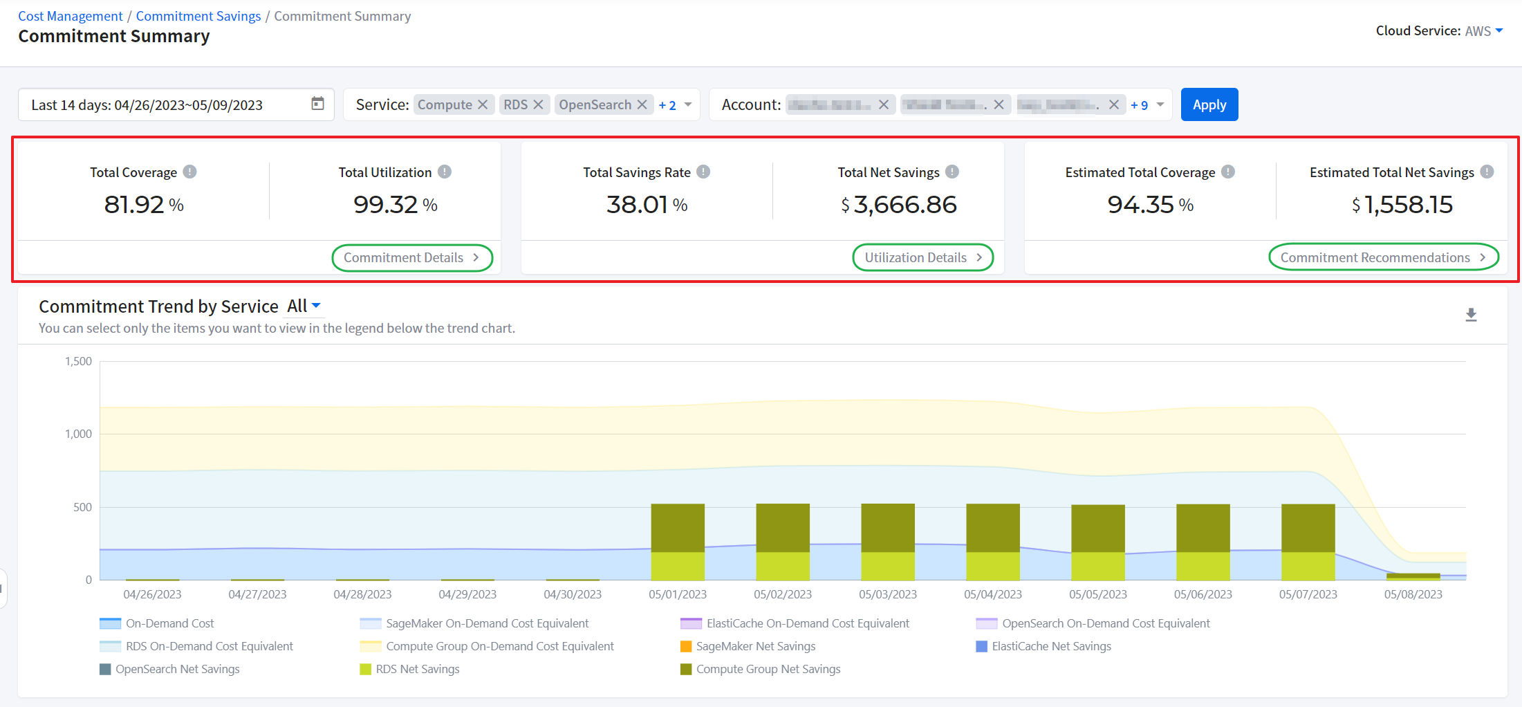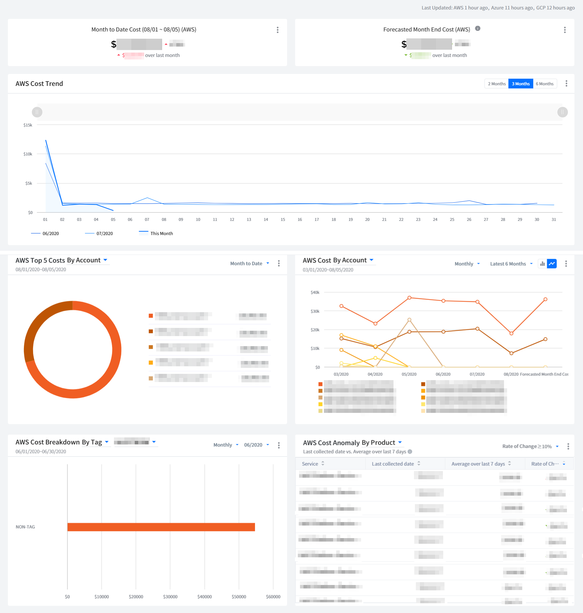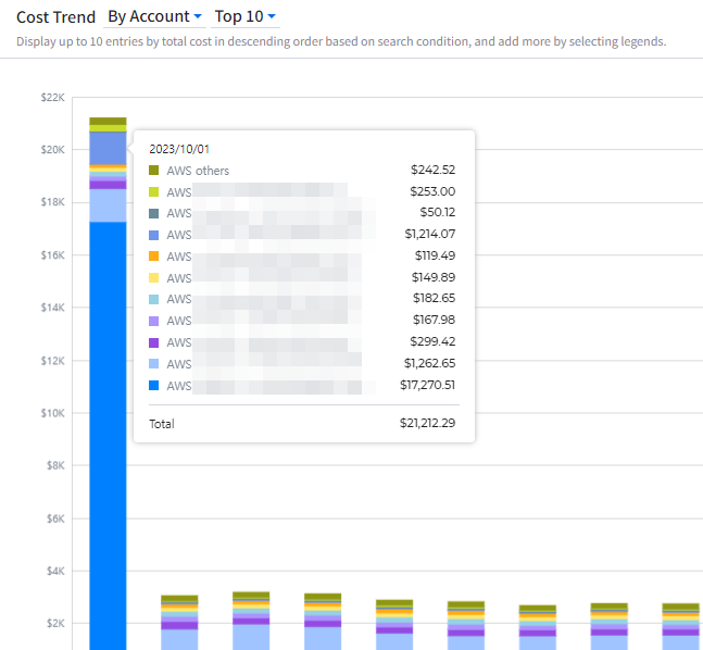 It provides graphical displays of cloud cost. It also allows you to check cloud cost by account, product and region. You can set a period and graphs type. If you move your mouse over the graph, a pop-up window will appear to show cost information by cloud account, product and region and total cost for the selected time period.