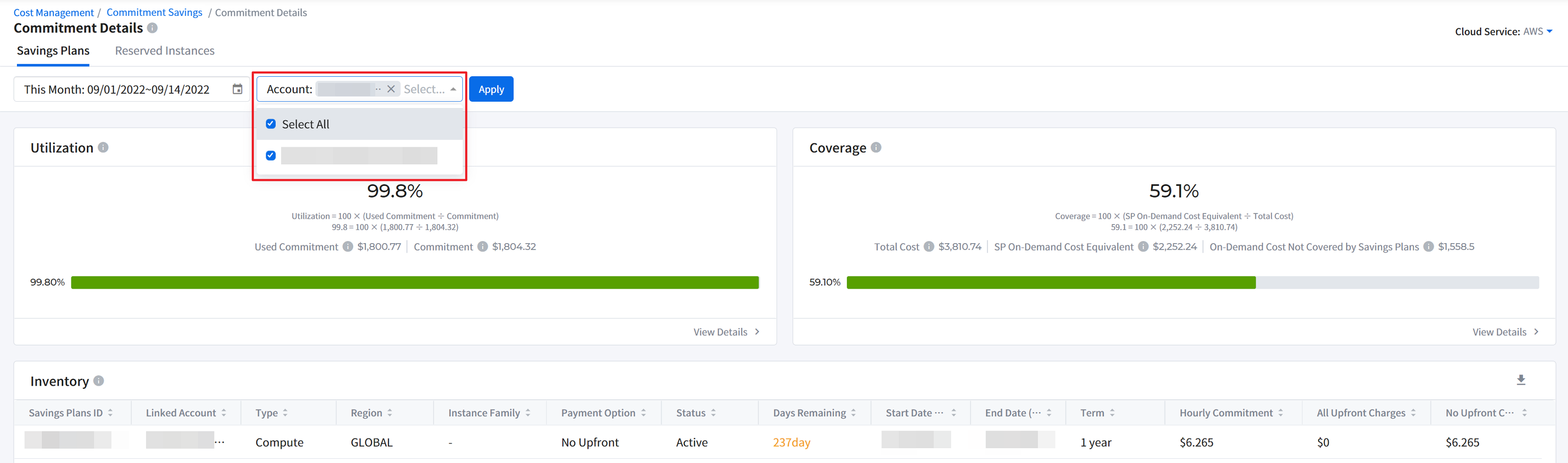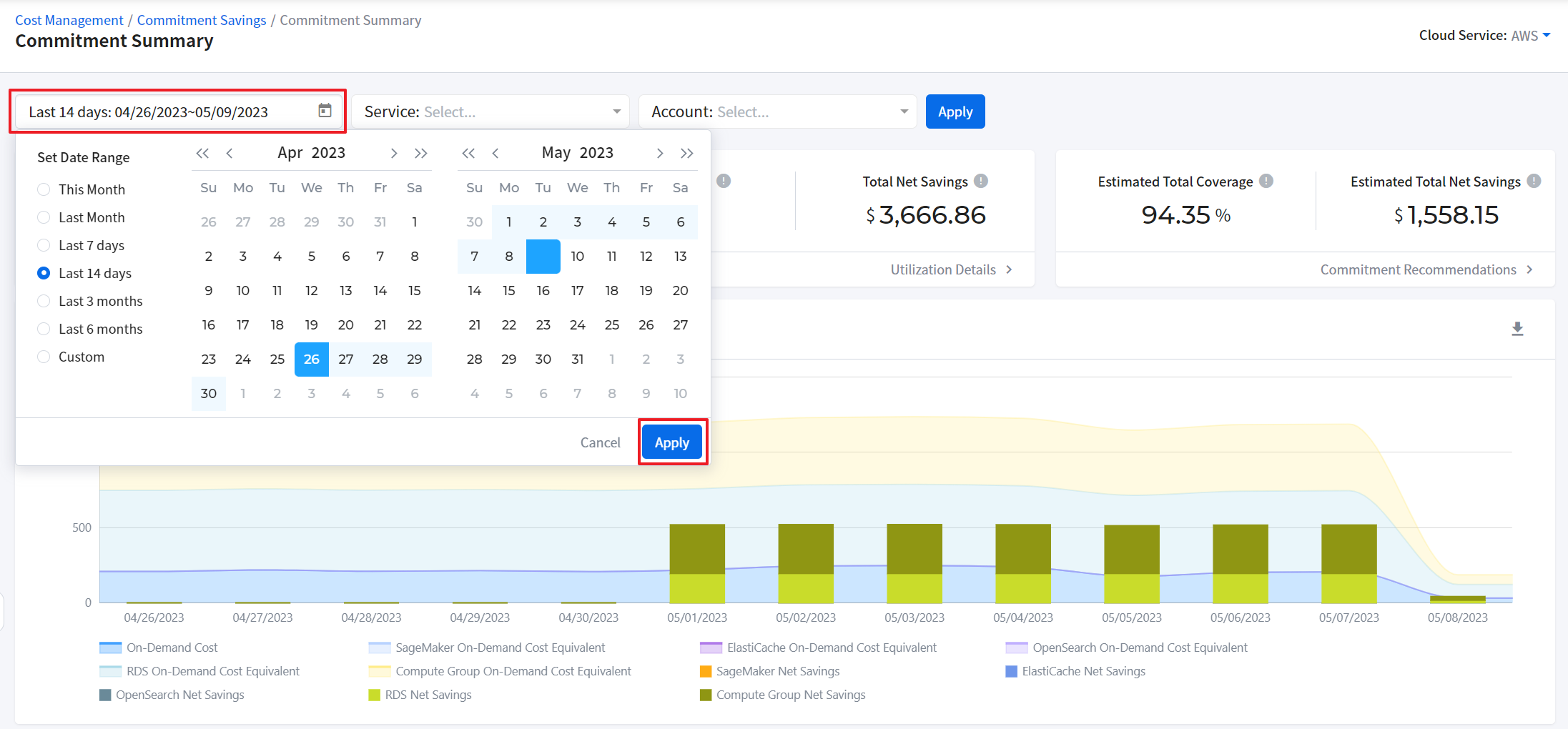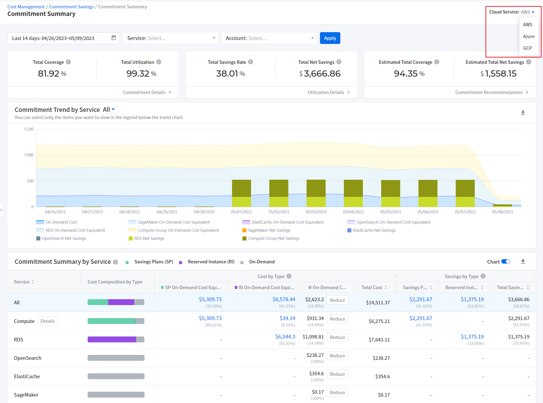 It provides graphical displays of cloud cost. It also allows you to check cloud cost by account, product and region. You can set a period and graphs type. If you move your mouse over the graph, a pop-up window will appear to show cost information by cloud account, product and region and total cost for the selected time period.