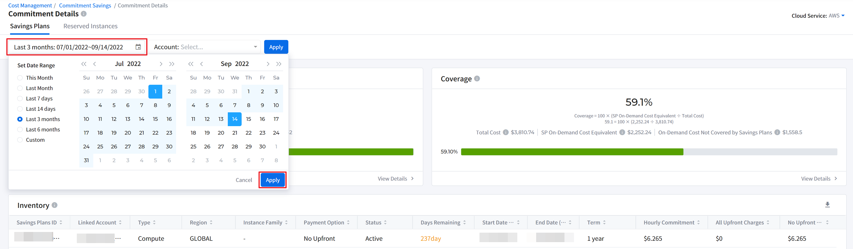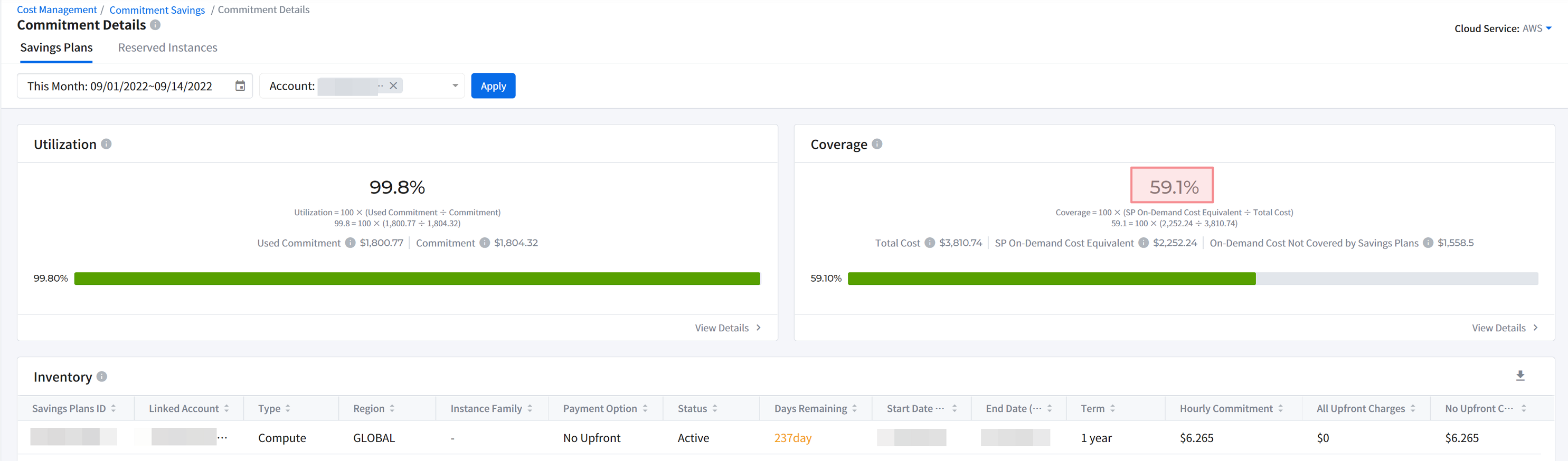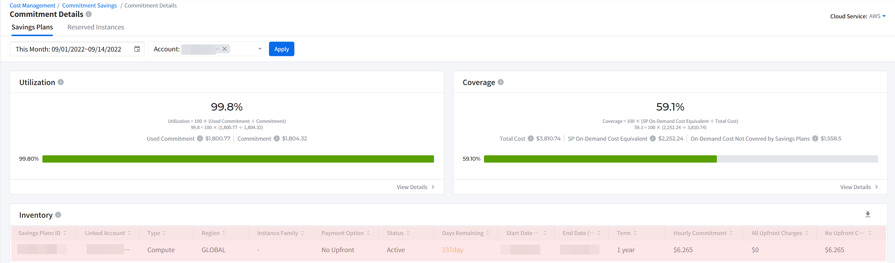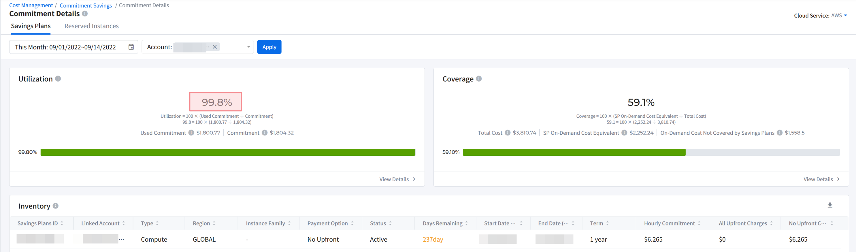 It provides graphical displays of cloud cost. It also allows you to check cloud cost by account, product and region. You can set a period and graphs type. If you move your mouse over the graph, a pop-up window will appear to show cost information by cloud account, product and region and total cost for the selected time period.