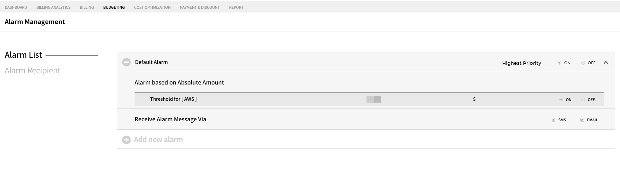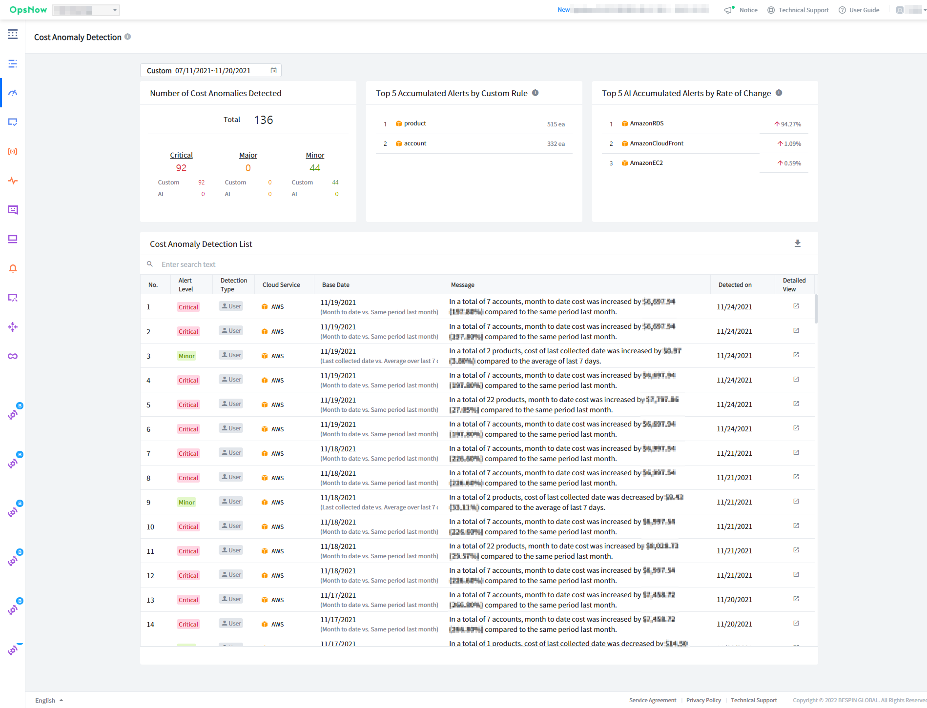It analyzes cloud usage and costs based on custom rules, detects anomalies when the rules are not met, and sends alerts. When detecting anomalies, you can filter costs by account, product, or region as analysis criteria, and set a date range to compare, for example, if you select 3 days, you can compare it with the 3 days prior to the selected 3 days. When sending anomaly alerts, you can categorize alerts as critical, major, or minor by allocating a certain amount of money to the alert band. You can set delivery options to send alerts, and set recipients for receiving alerts via AlertNow or email.
