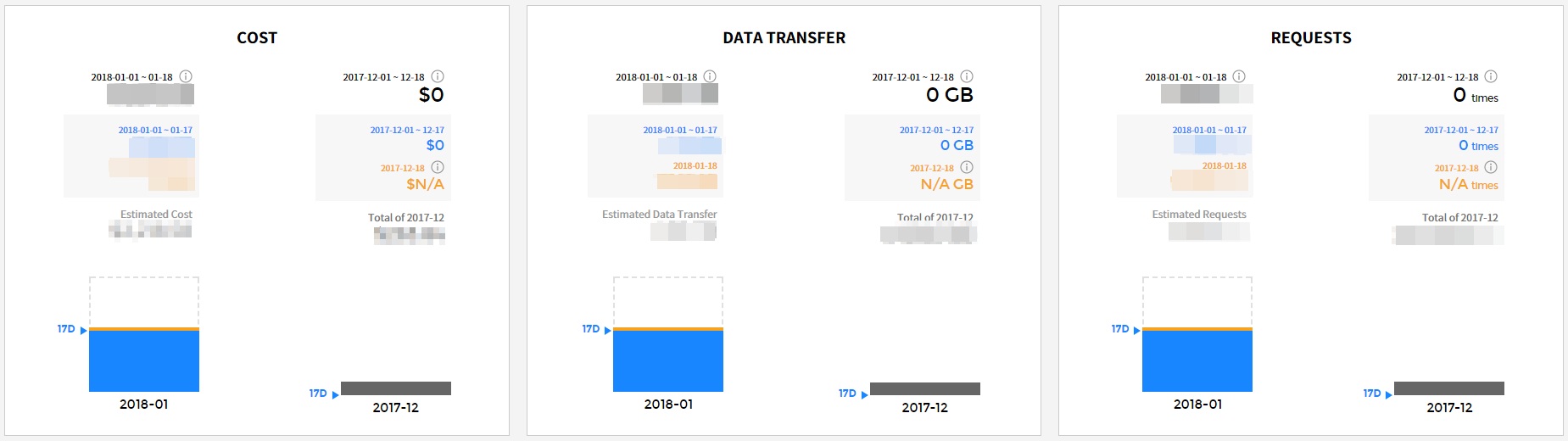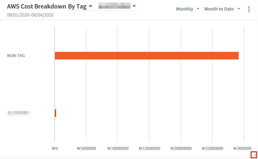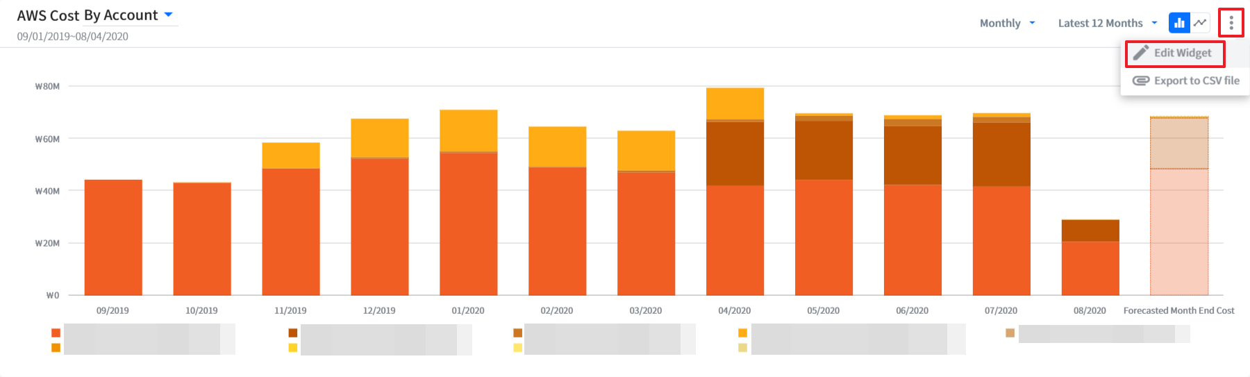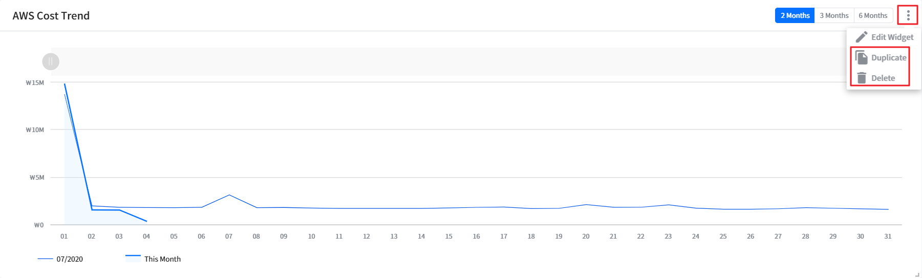 This widget shows how much you will owe at the end of the month and compares your estimated costs to your actual costs of the previous month. You can see the forecasted month end cost for each cloud service by changing the cloud service option.