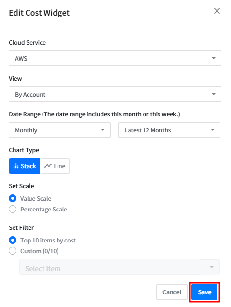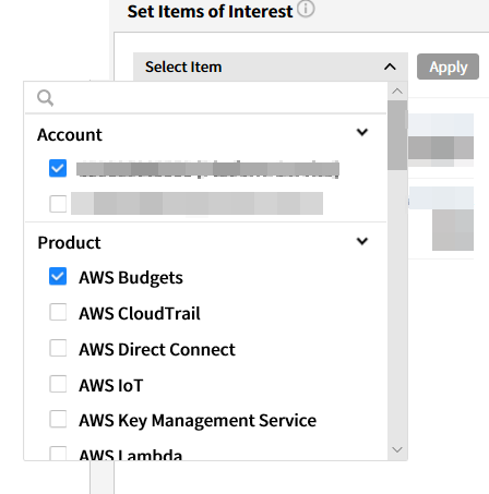 You can select items you want to display on the dashboard. If you click the [Select Item] button, available items are shown in the drop-down menu. The selected costs will be displayed on the dashboard until you make some changes.