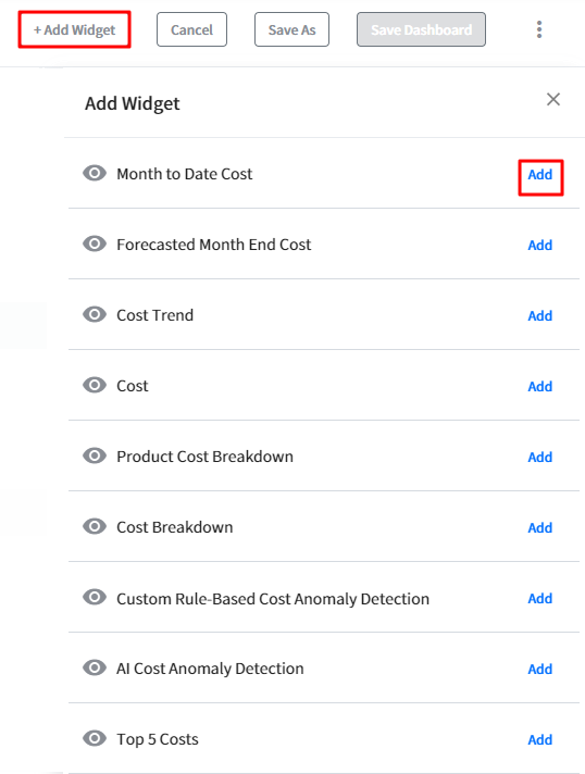 We are providing multiple widgets such as Cost Trend, Cost Breakdown, and Top 5 Costs. It describes the types and features for each widget.