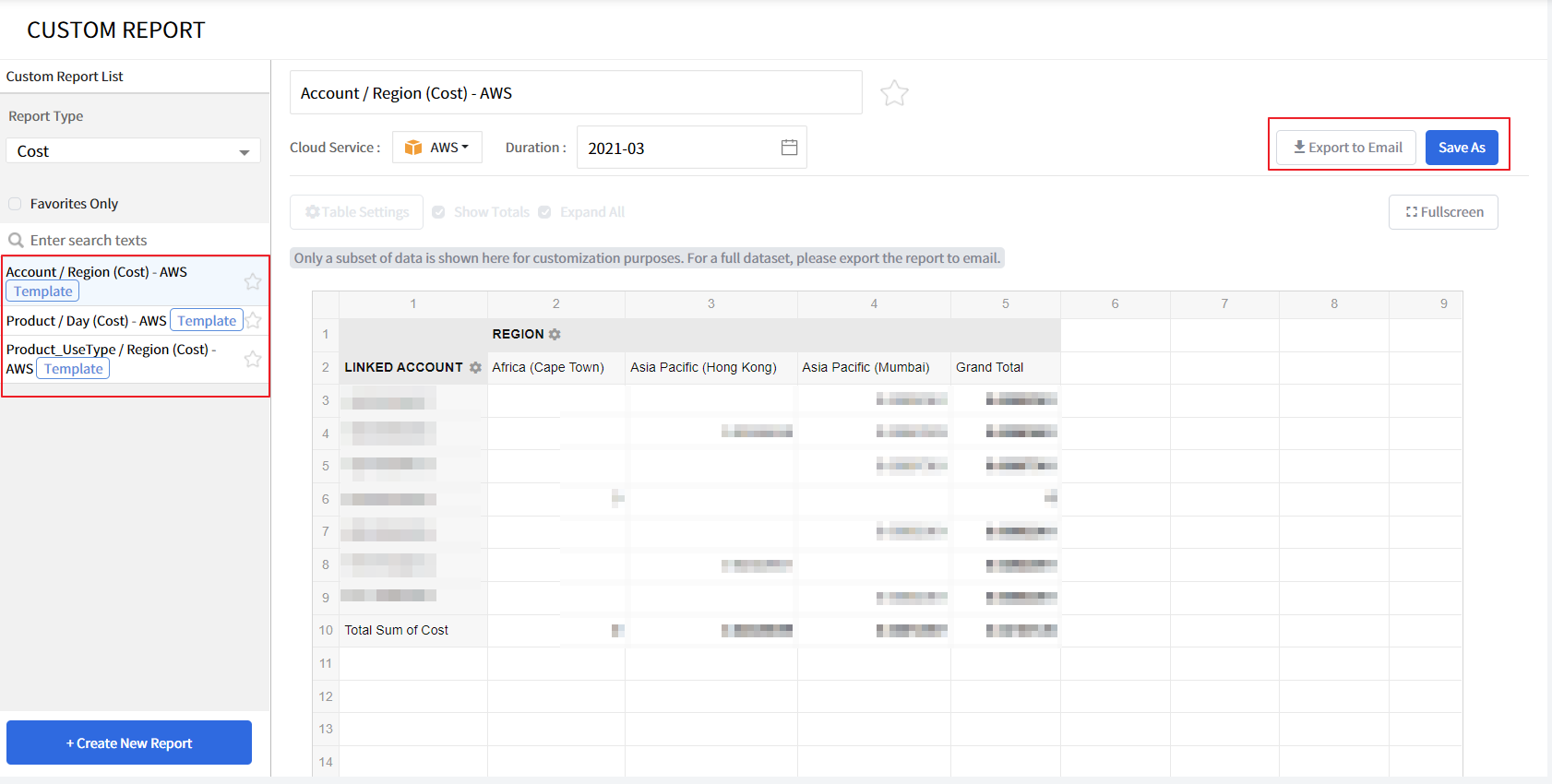You may select any of the basic report templates by clicking the [Save As] button on your upper right side or you may configure a new report with a customizable report element by clicking the [+ Create New Report] on your lower-left corner of the screen. Only a subset of data is shown here. For a full dataset, export the created Custom Report to your registered email to download it.