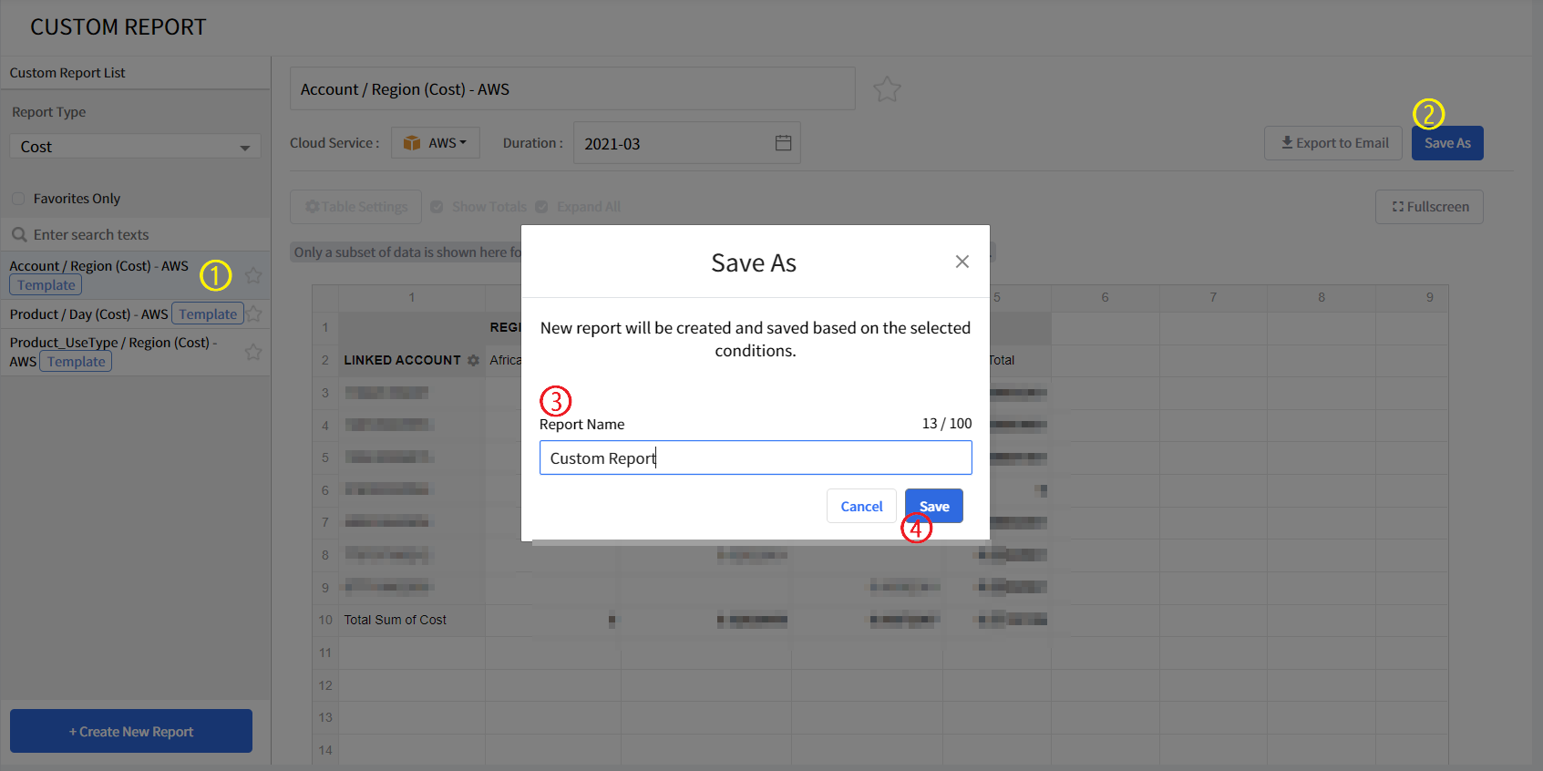② Start creating a new [Custom Report] by clicking the [Save As] button.