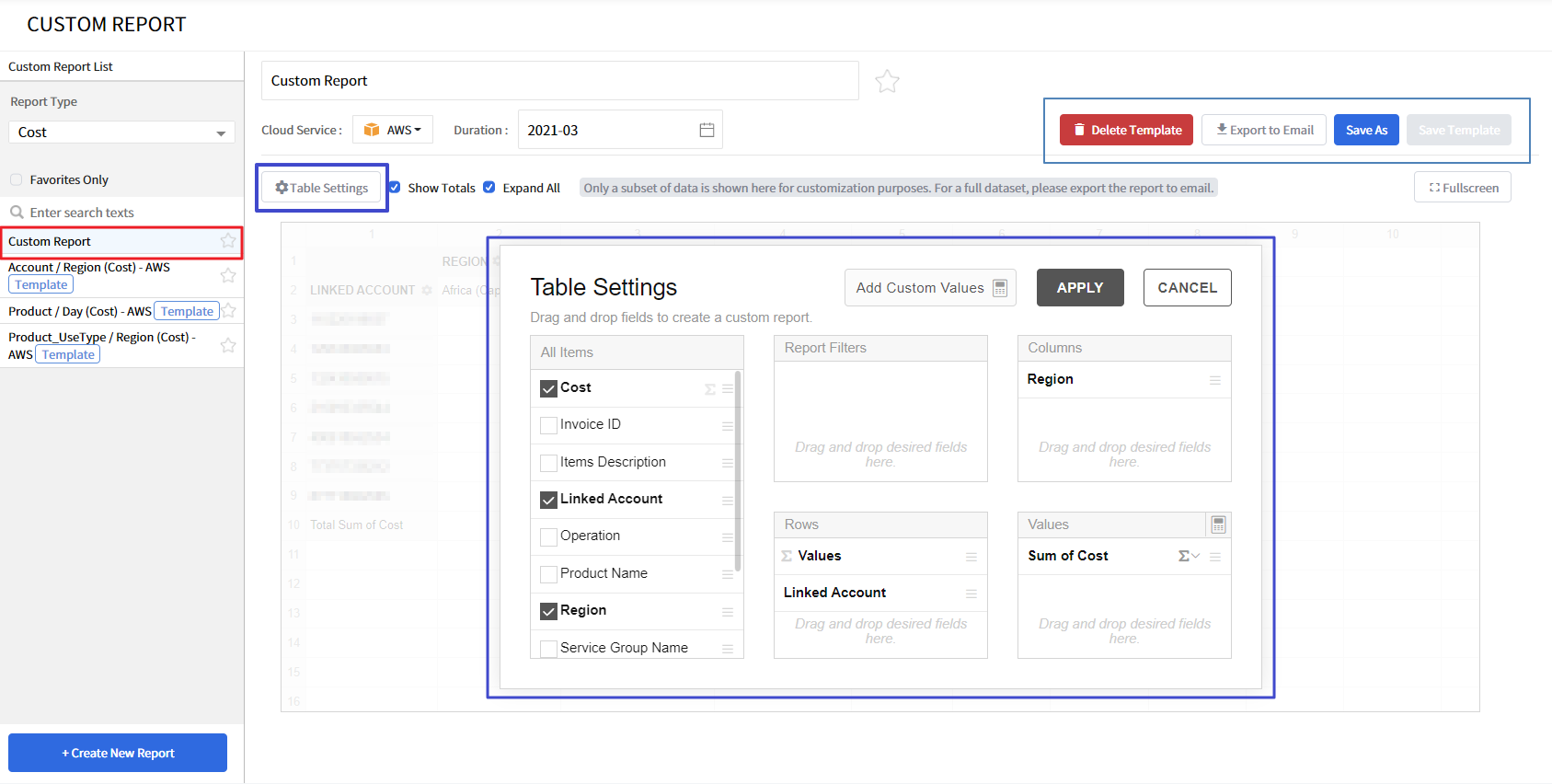 • When a new custom report is added to the list, [Delete Template] and [Save Template] buttons appear on the upper right side. Currently, only AWS Cloud Service is supported with our Custom Report menu. We will expand this service to other Cloud Services shortly.