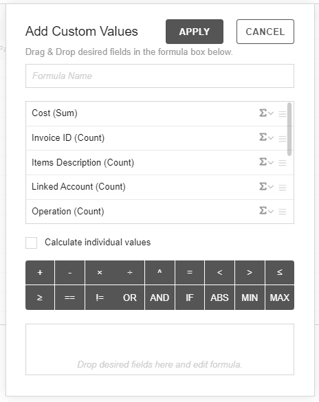 • You can create or edit custom formulas as you want. Drag and drop items, functions, values to the lower box and click [Apply].