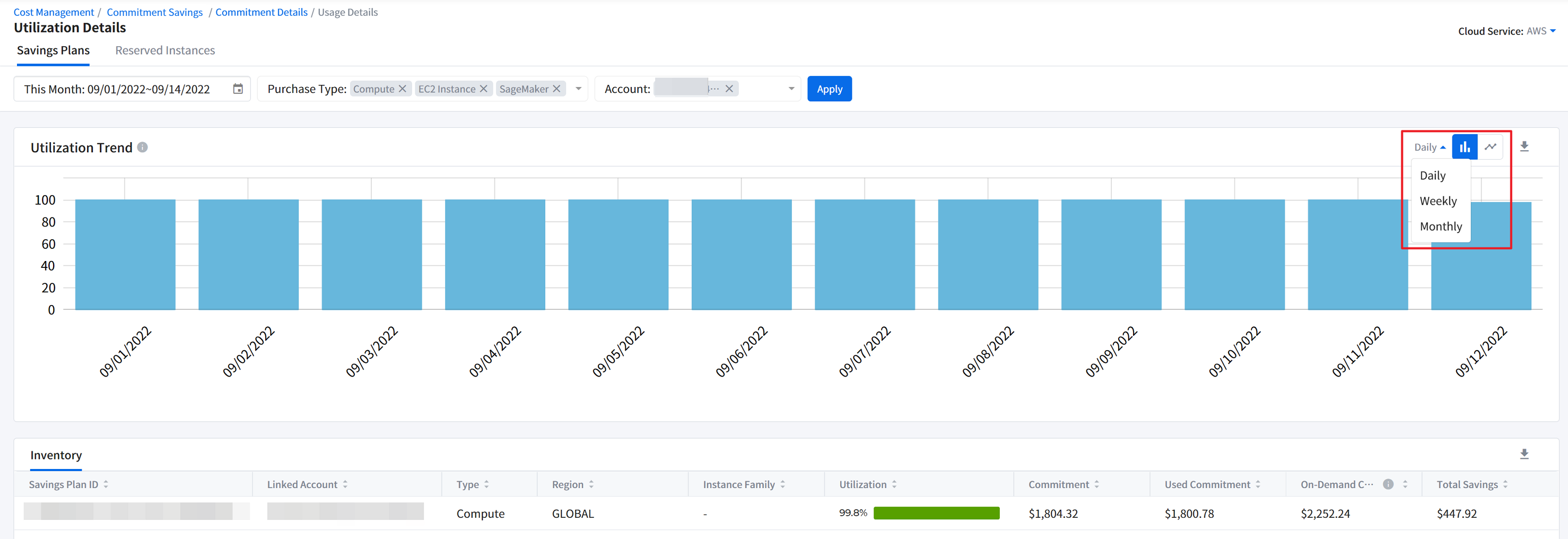 - Aggregated: It shows aggregated costs for the month-to-date (MTD).