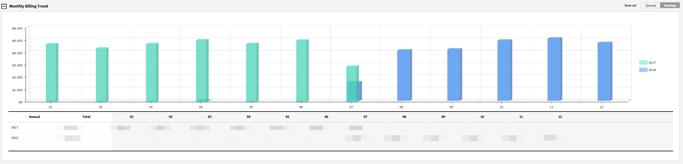 You can check cost trends on a monthly basis for up to 3 years. It allows you to visualize trend charts by clicking [Display All] or [Overlay] button, which is located at the top-right corner of the grid.