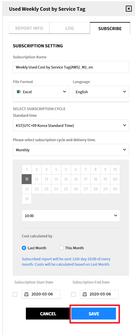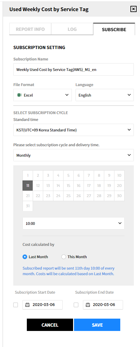 We provide a report automatic mailing feature to all customers who use Cost Management services and who have the permission to edit the Report subscription menu. Report subscriptions allow you to create a Report Subscription or manage it through edit or delete, view the history of each subscription, and download files that have been sent. In addition, it provides a feature to manage recipient by creating or deleting external email or desired email. Recipient can be specified when creating/editing subscription. The History Tab allows you to view past send history including the send history of deleted subscriptions.