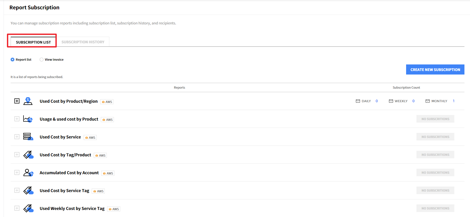 Cost Management > Report Subscription > Subscription List