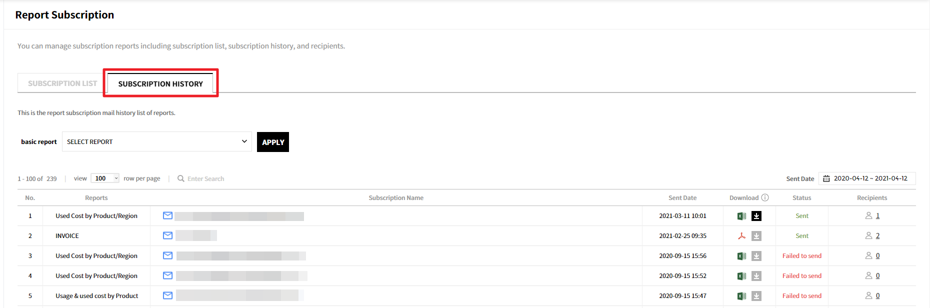 You can check the send history after setting the subscription, and download the file that was sent for the recent send (within 1 month) history. You can apply the report type, send date, and subscription name filter.