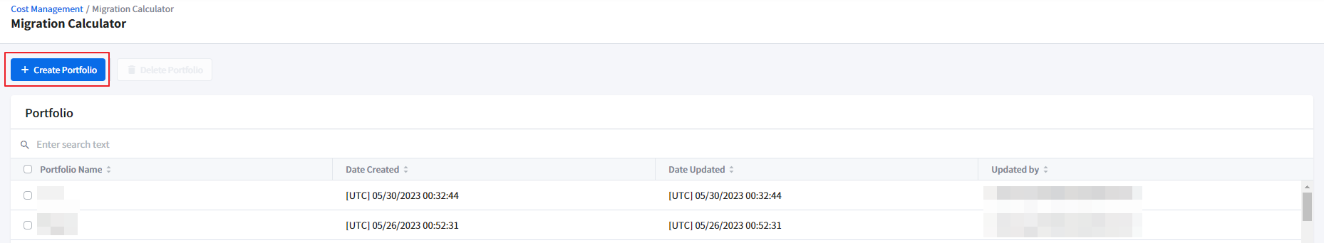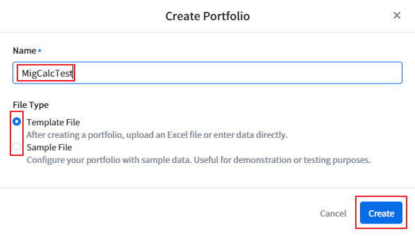 Click the [+ Create Portfolio] button at the top left of the Migration Calculator screen.