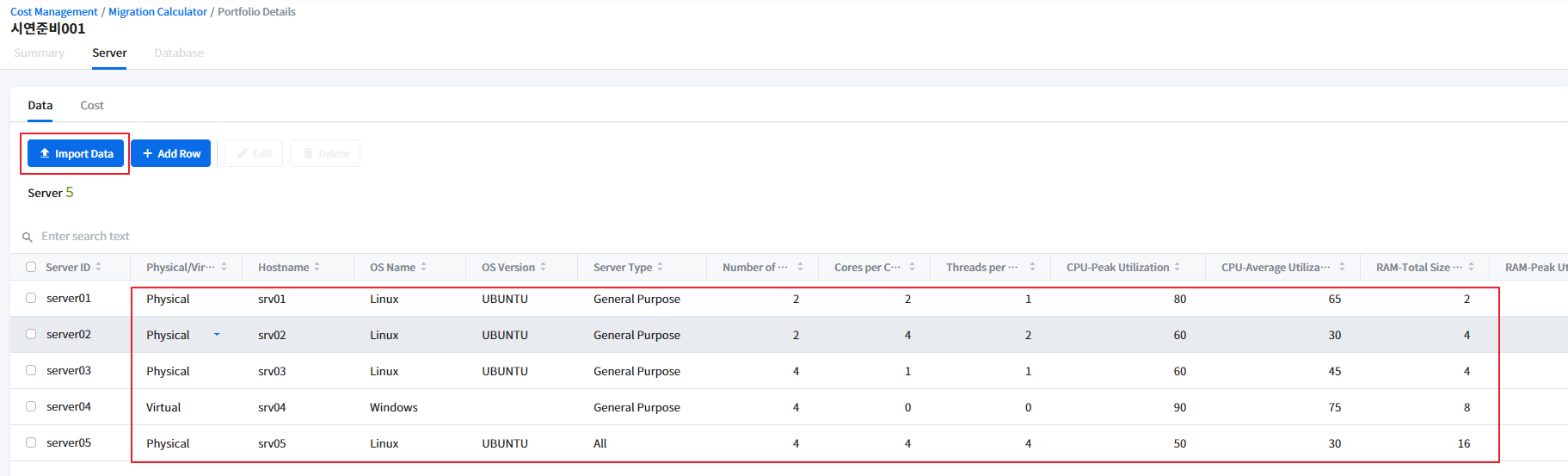 - Click the created portfolio to edit and enter server data directly on the screen, or click the [Import data] button on the top left to upload a file and import data.