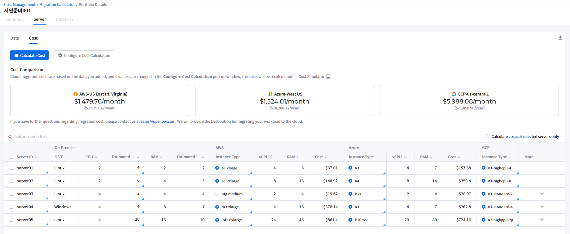 On the Server > Cost tab, you can view and compare server costs by cloud service based on the data you entered.