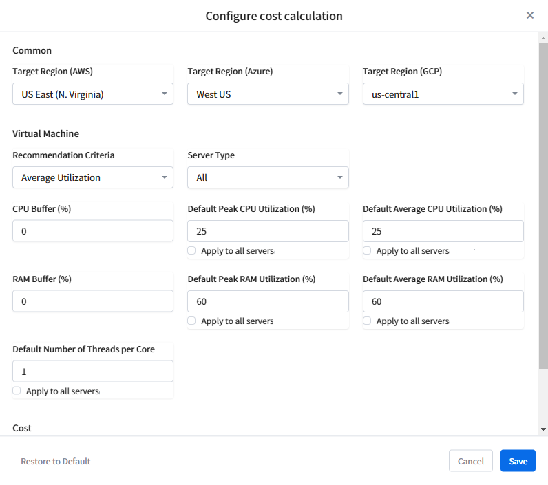 Click the [Configure Cost Calculation] button on the top left of the screen to modify the values for calculating the cost, such as region, server type, server usage, and currency unit. Click Restore to Default on the bottom left to enter The default values stored in the system.