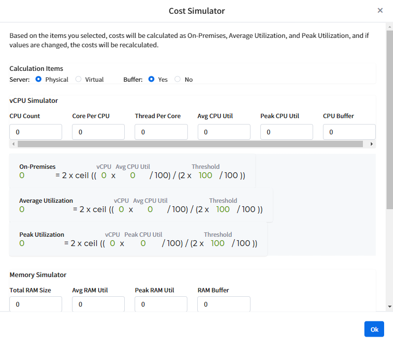 Click the [Cost Simulator] button at the top center of the screen to see the formula for calculating costs. Enter your values into the simulator and you’ll see your on-premises, average utilization, and peak utilization along with the formula.