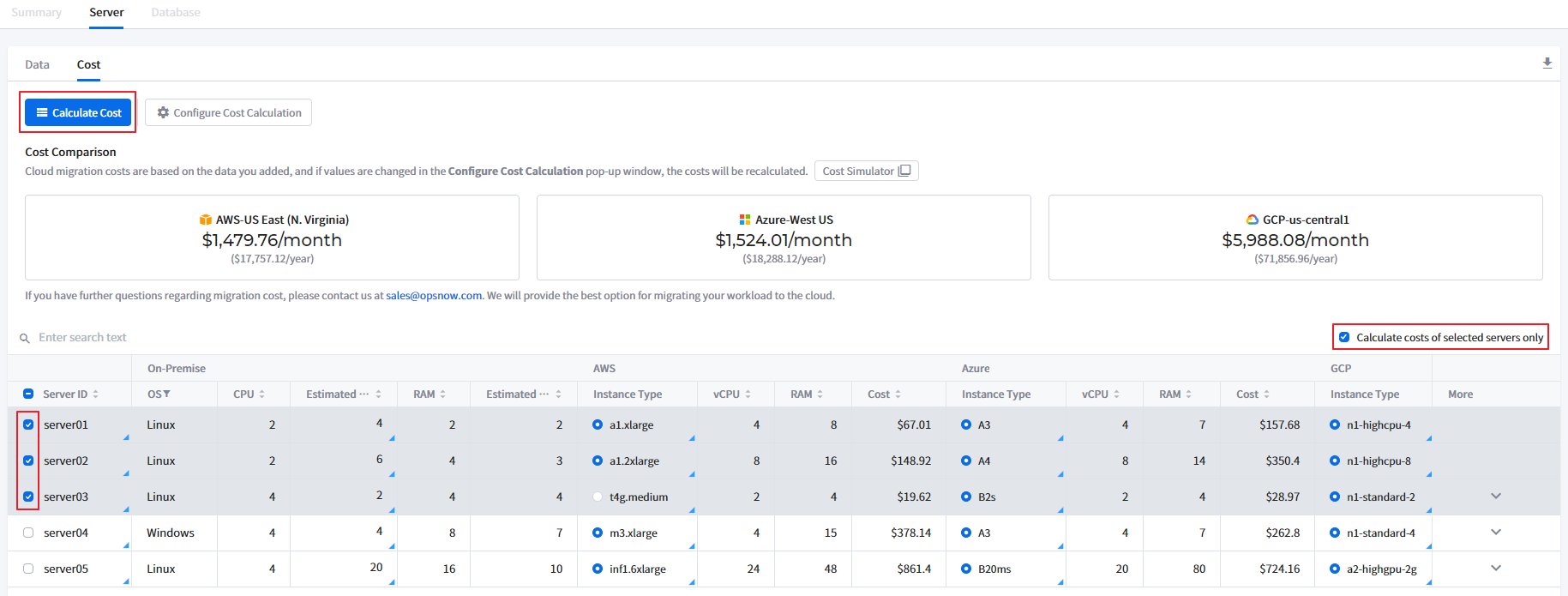 - Go to the Server > Cost tab to see the cloud cost based on the server data you entered.