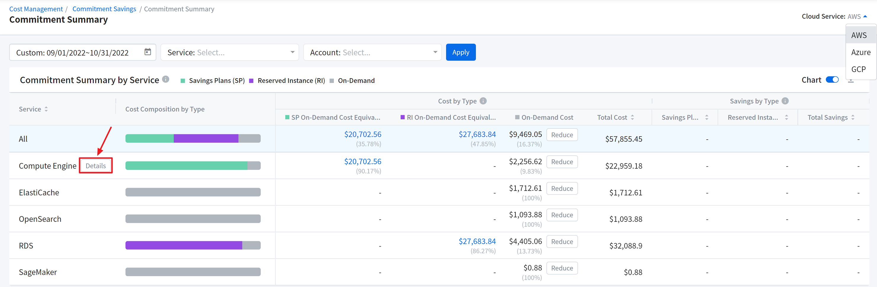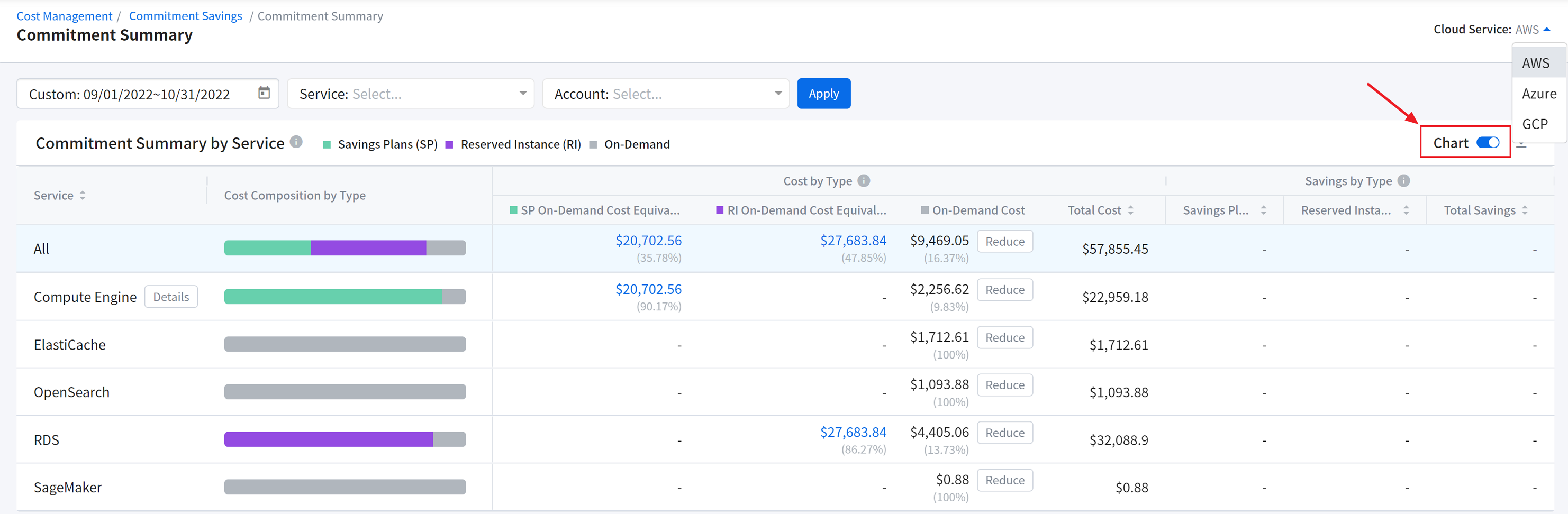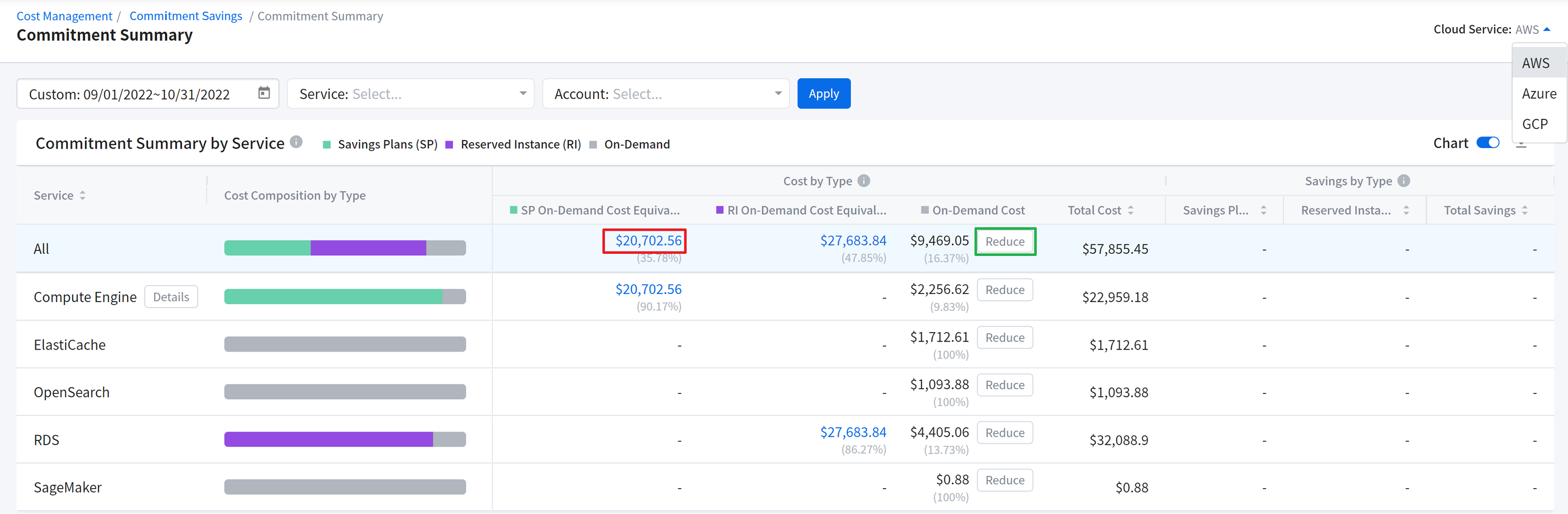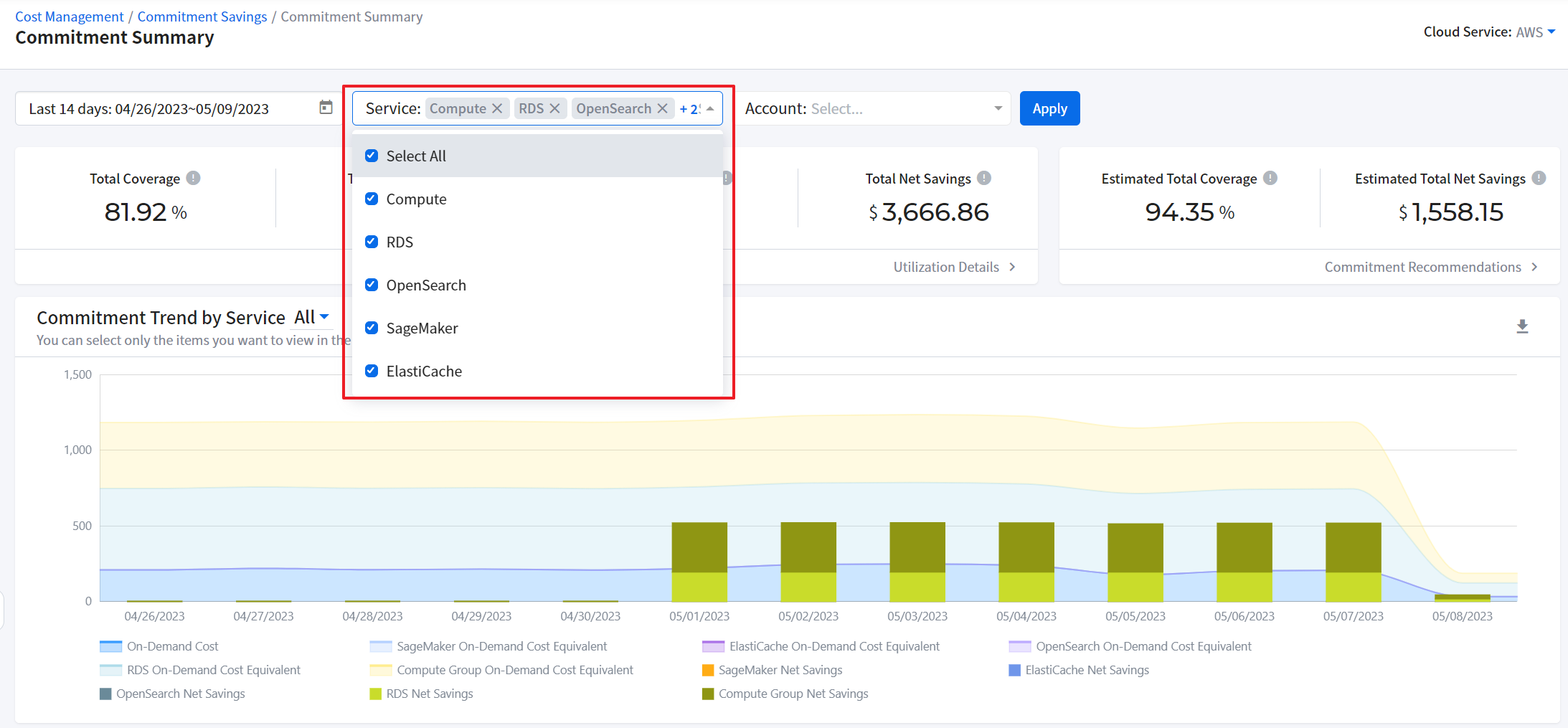If you are using more than one Cloud Service, select multiple Cloud Services in this single widget to view the integrated cost breakdown by service groups in the bar chart.