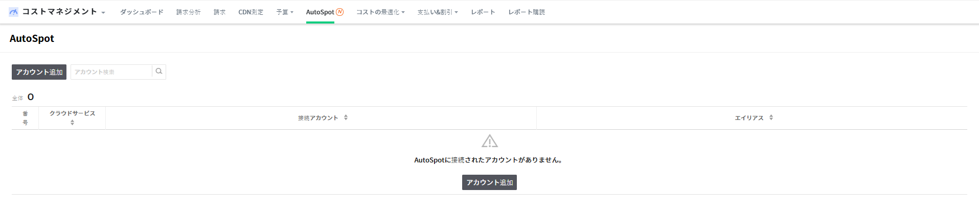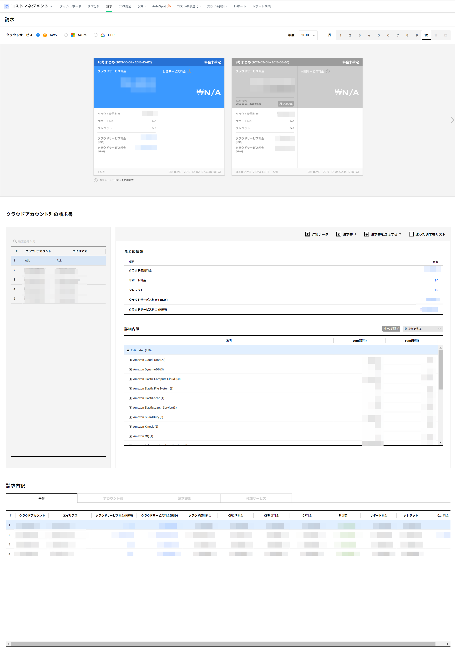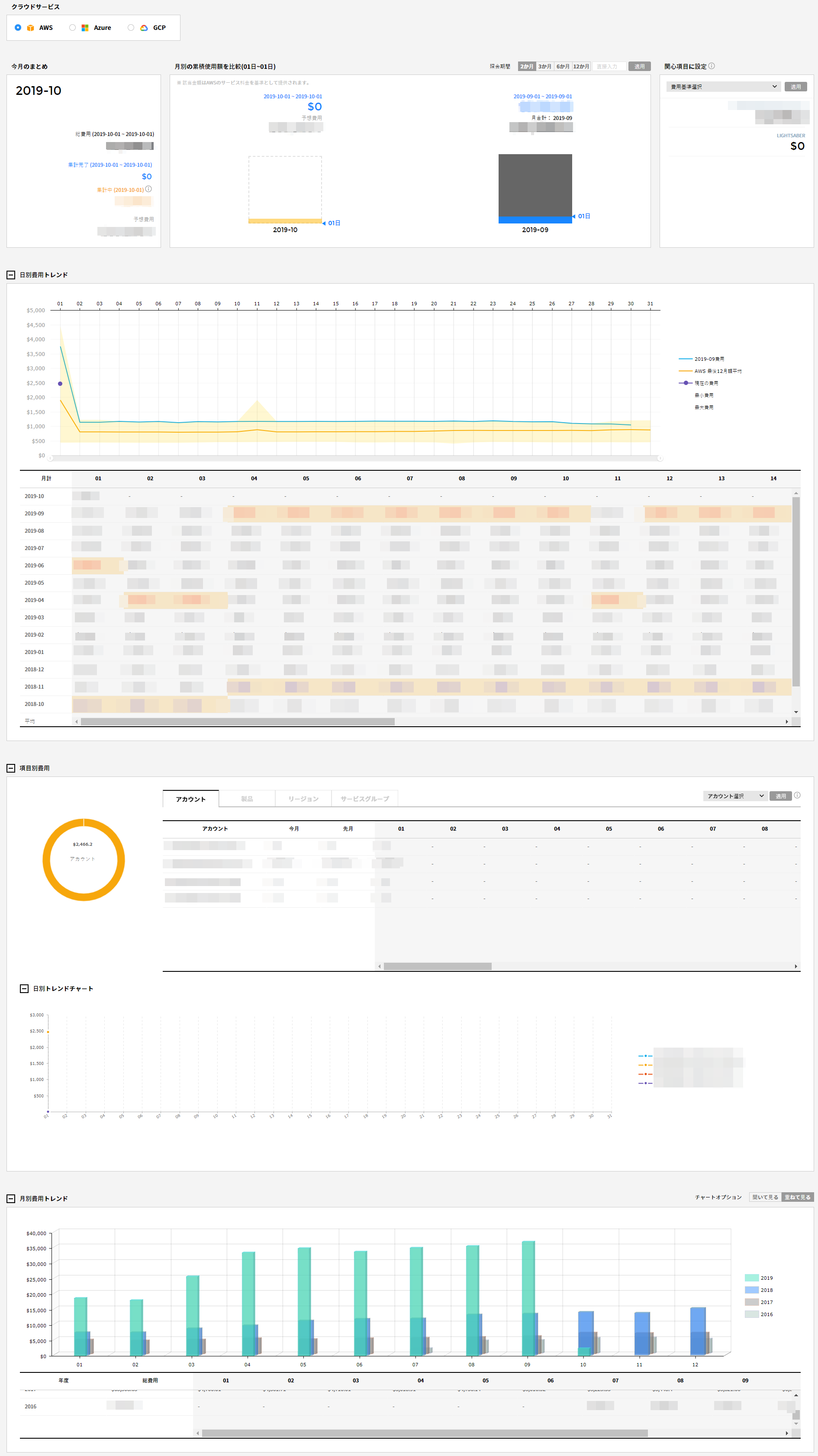 現在使用中のクラウドサービスとアカウント情報が表示されます。選択したクラウドサービスとアカウントの使用料と費用トレンドなどを様々な形式で確認できます。