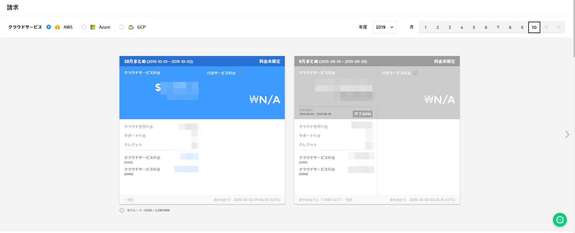 クラウドサービス別に月請求書のまとめ内容を確認でき、まとめ内容にはクラウド使用額、サポート額、割引額などが含まれます。また、まとめ内容のみシンプルなカードビューで表示されるため、ユーザーがひと目で先月の料金と比較分析できます。