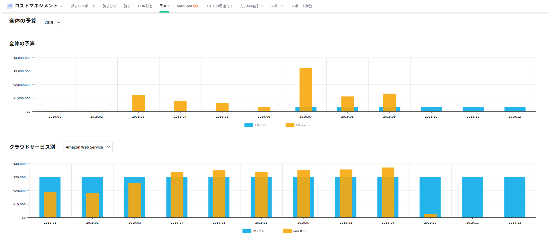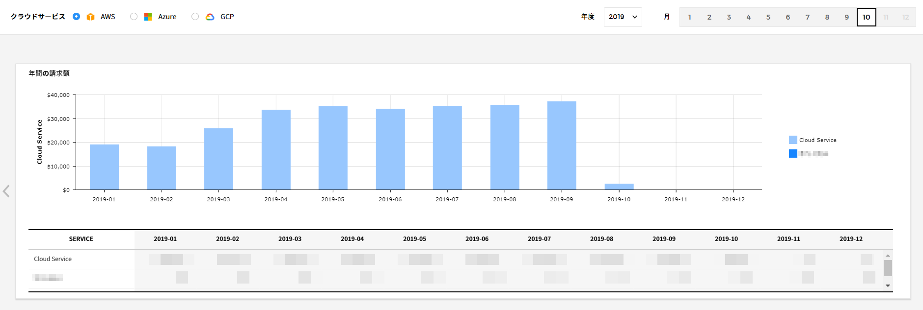 - 期間選択:右上のメニューで請求書を確認する年度と月を選択できます。例えば、2019年1月を選択すると、1月の請求書と2018年12月の請求書を共に表示して先月のコストと比較分析できます。