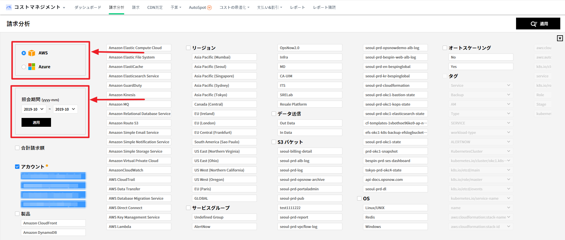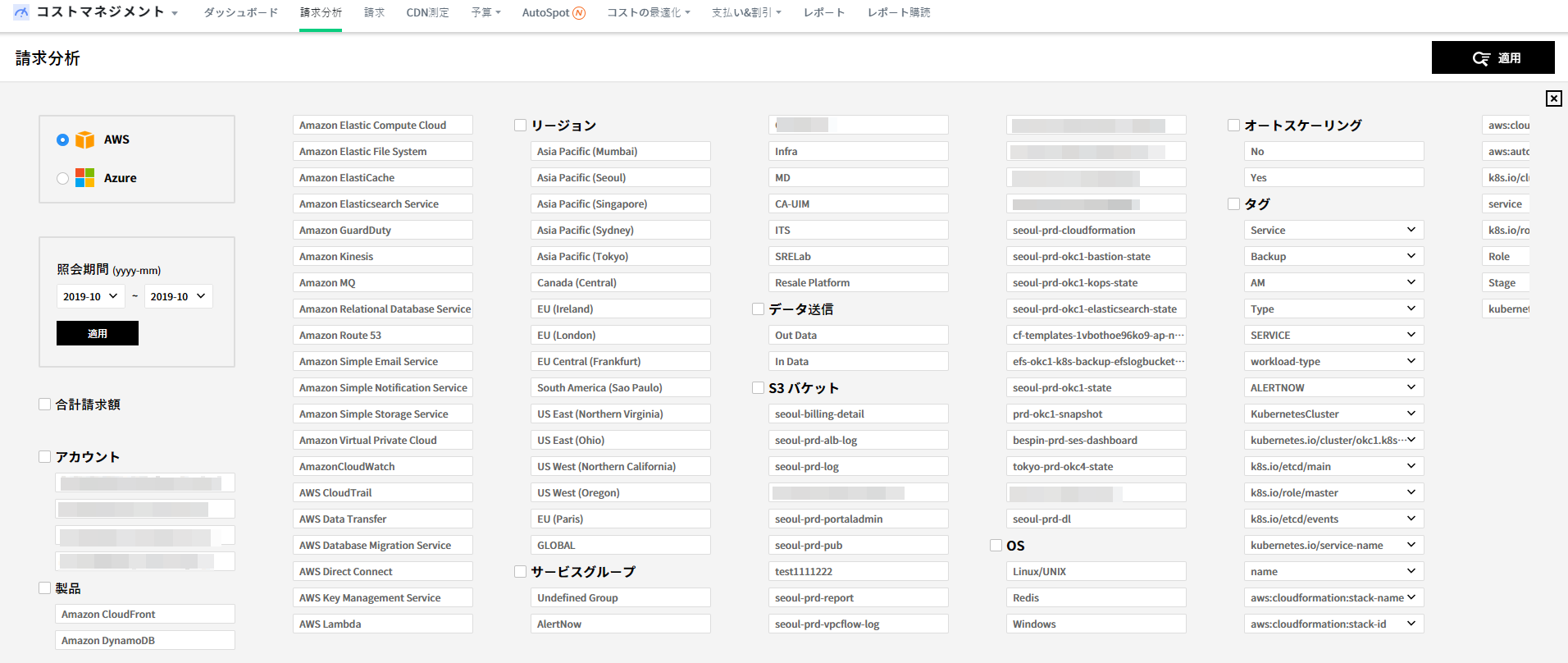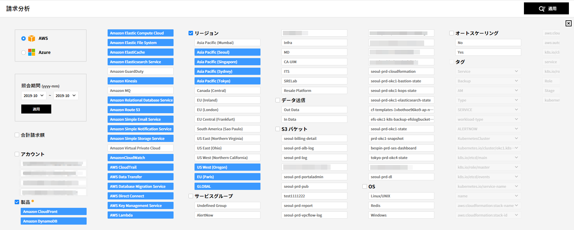 検索するサービスと期間を選択すると、該当期間内に使用したアカウント、商品、リージョン、サービスグループなどが検索条件に表示されます。照会期間は選択した後、照会期間ボックス内にある[適用]ボタンをクリックすることで選択した期間が適用されます。
