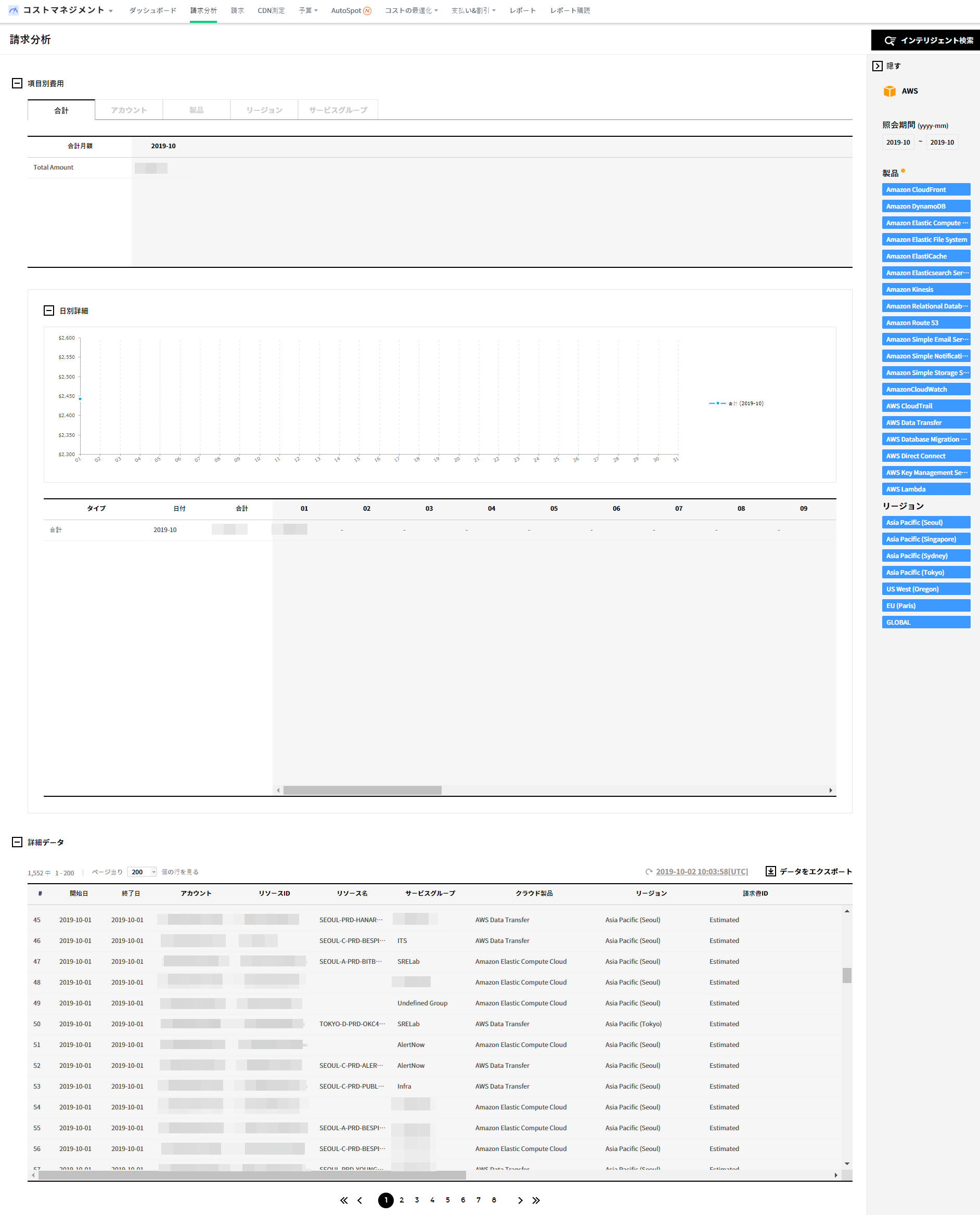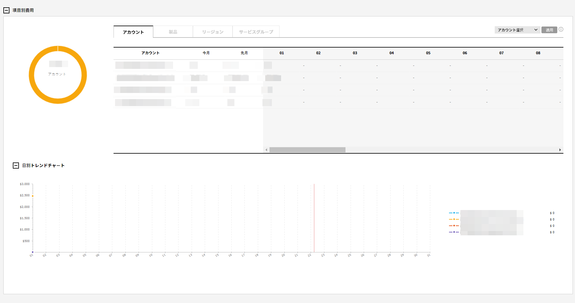 アカウント、商品、リージョン、サービスグループ別に区分してコストを確認でき、選択したカテゴリ別に日別詳細発生コストとトレンドチャートを確認できます。項目別のコストデータテーブルで全体、アカウント、商品、リージョン、サービスグループタブをクリックする際、各項目別に区分されたコストを確認できます。