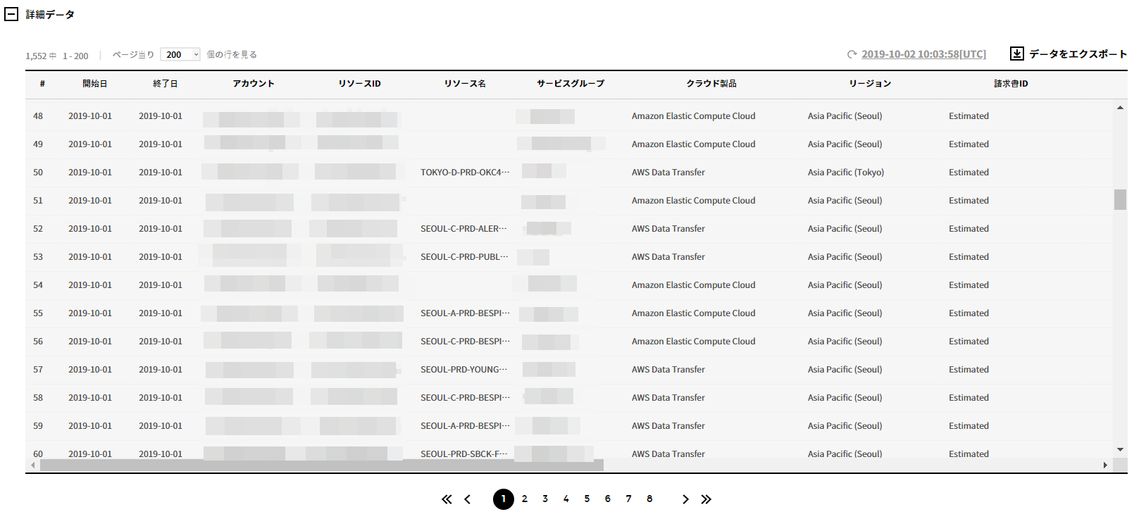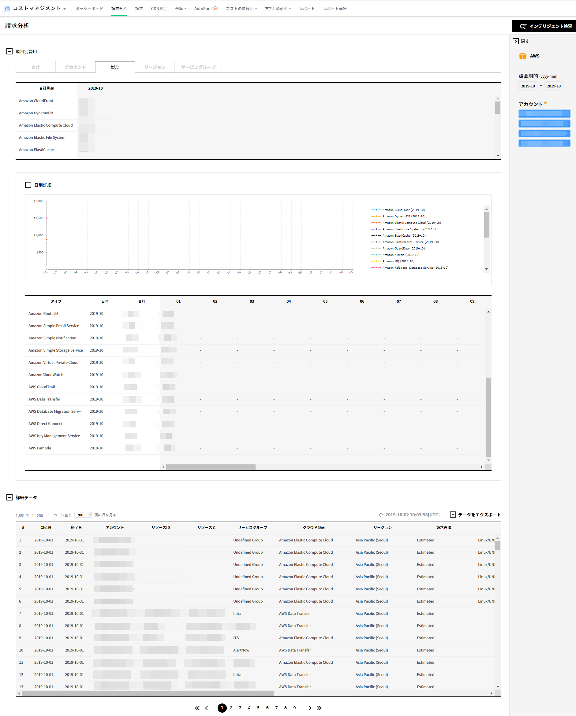 全体のコスト情報だけではなくアカウント別、請求書別、付加サービス別に料金情報を確認できます。