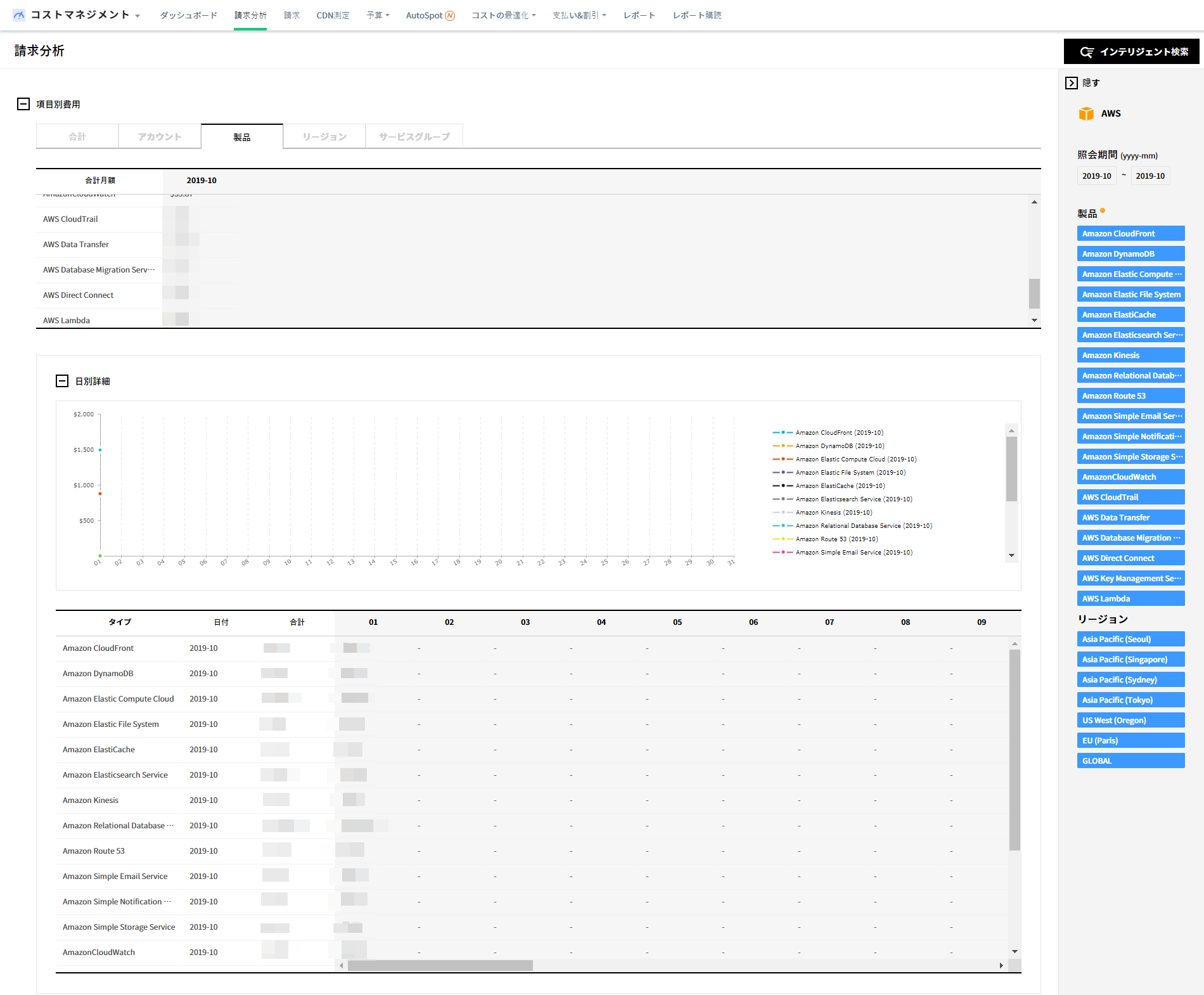 アカウント、商品、リージョン、サービスグループ別に発生コストを確認でき、項目別コストに対する日別トレンドチャートも提供されます。