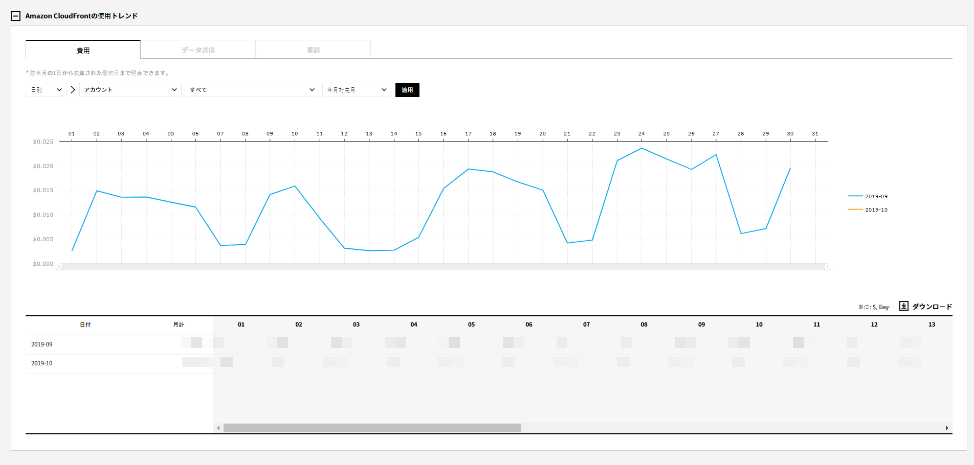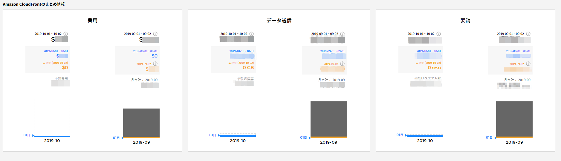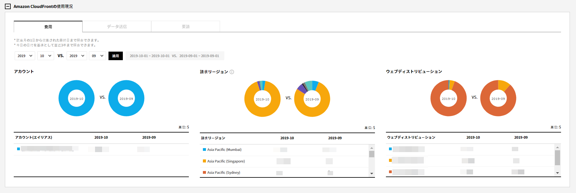 - コスト:選択した月のアカウント別、リージョン別、ウェブ配布別のコストを比較確認できます。