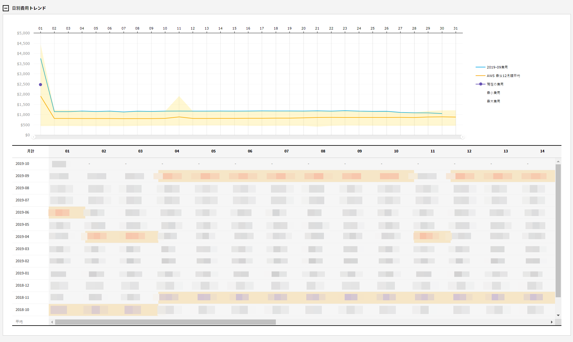 日別費用トレンドで選択した期間の費用トレンドチャートと詳細データを日別に提供します。日別費用トレンドで日別使用パターンと異常コストが発生した時点も確認できます。日別費用トレンドチャートとグリッドで日別最低コストと最高コストも確認できます。グリッド上で最低コストは赤色、最高コストは青色で区分できます。