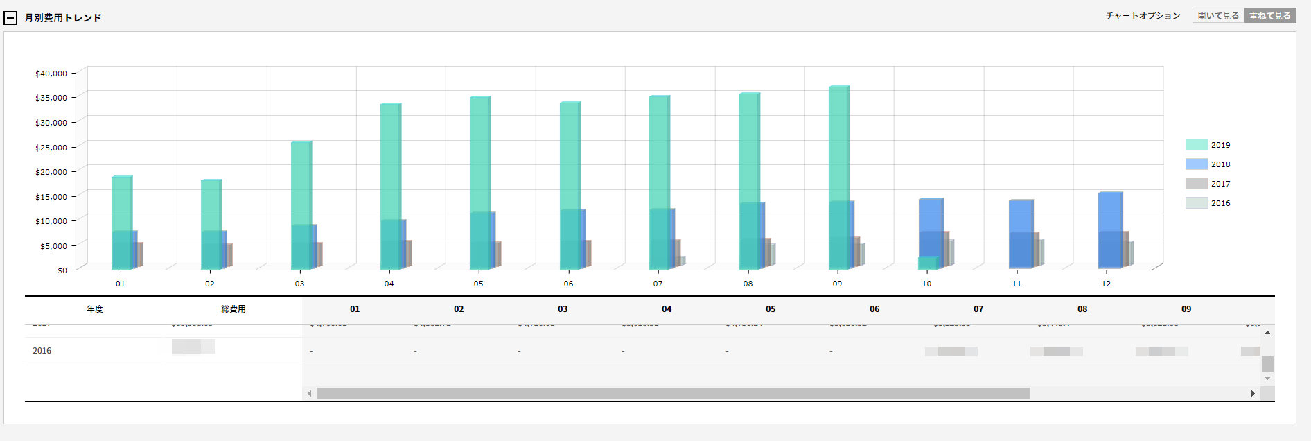 最大3年間の月別費用発生トレンドを確認できます。[開いて見る]と[重ねて見る]オプションで月別費用トレンドを視覚的に確認することもできます。