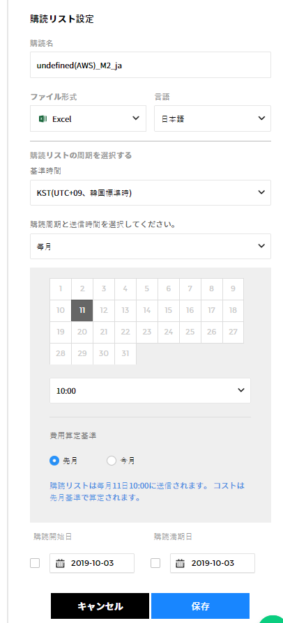 [購読名]、[ファイル形式]、[言語]、[基準時間]、[購読周期]、[時間]を入力して新規購読を作成できます。作成する際にレポート名、周期、言語設定などで構成された基本購読名が表示されます。同じレポートテンプレートの場合、同じ周期設定はできません。![]()