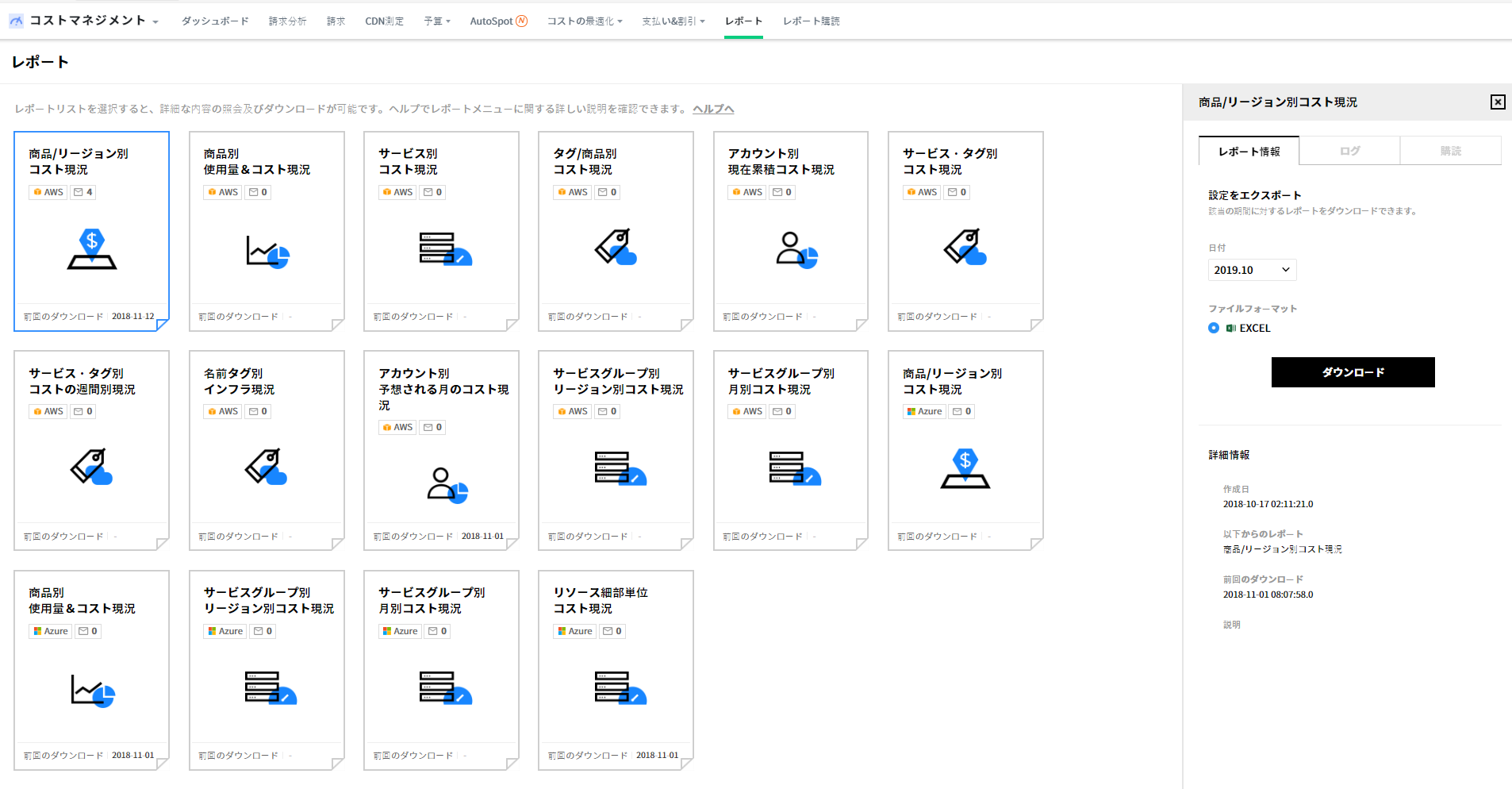 - コストマネジメントレポートは、Excel形式のレポートを提供し、請求メニューでエクスポートした請求書レポートの場合には、ExcelとPDF形式をサポートします。