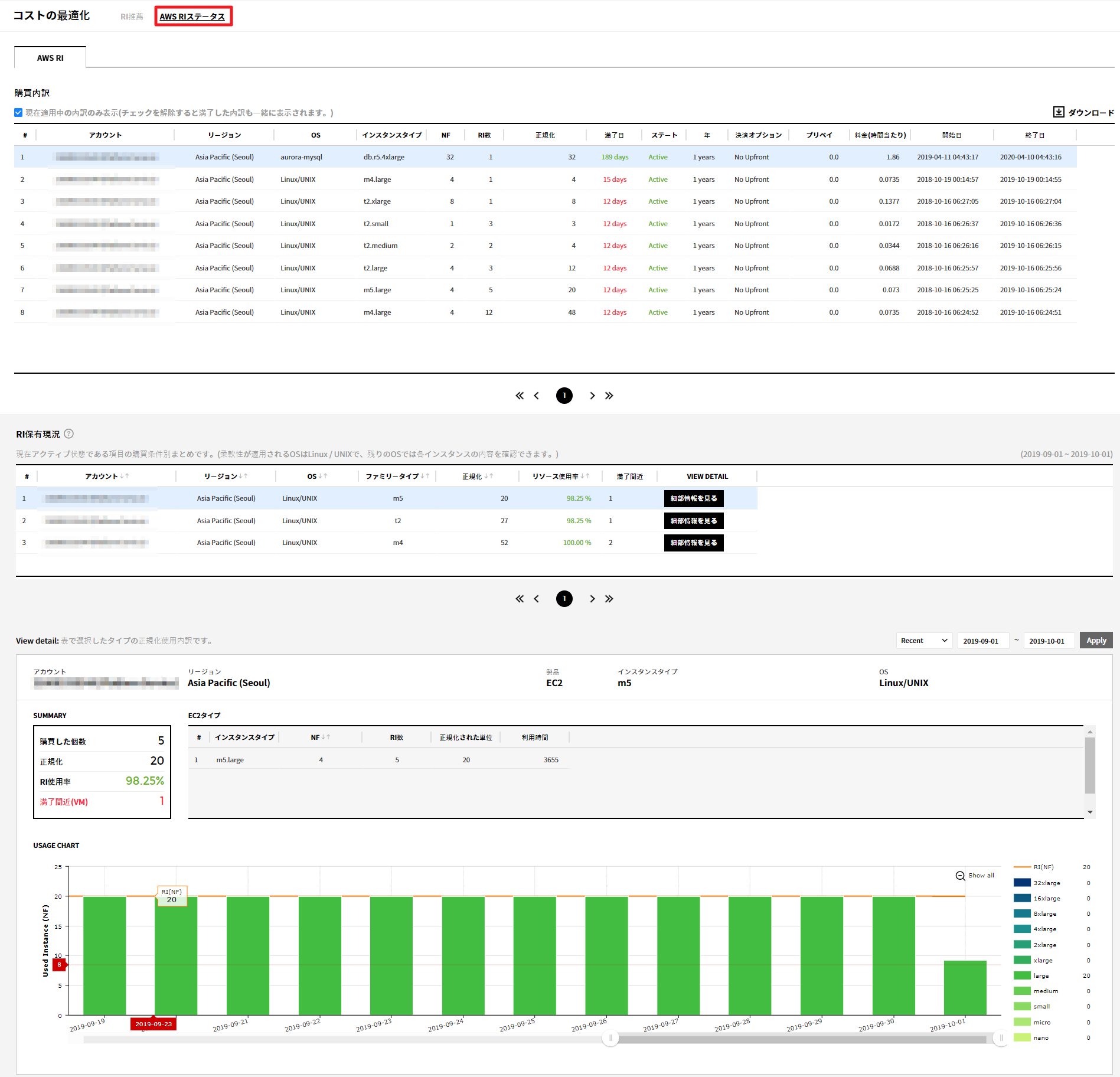 - アカウント選択:左側のテーブルで確認したいアカウントを選択できます。選択したアカウントのまとめ及び詳細情報が右側の表に表示されます。