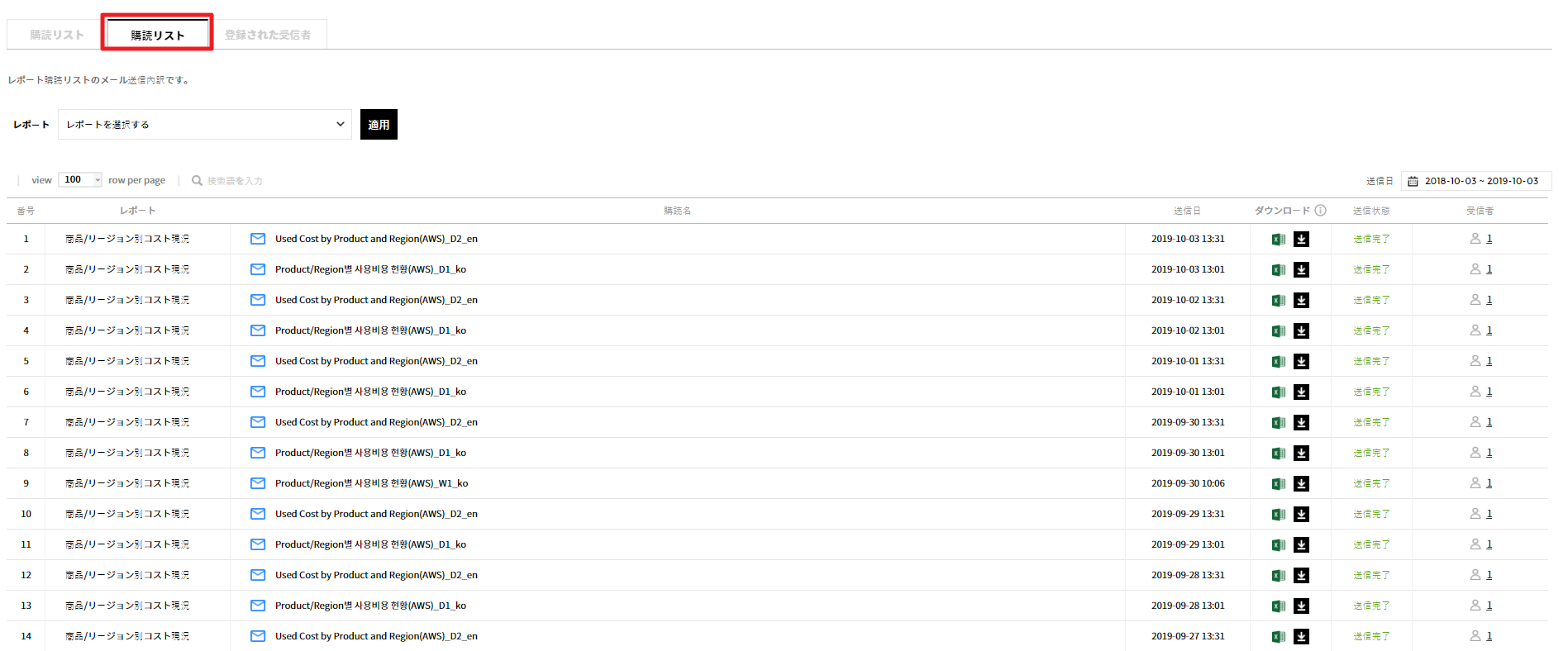 購読設定後、送信した内訳に対して確認し、最近送信(1ヶ月以内)の内訳に対して送信済みのファイルはダウンロードできます。レポート種類、送信日、購読名のフィルター適用が可能です。