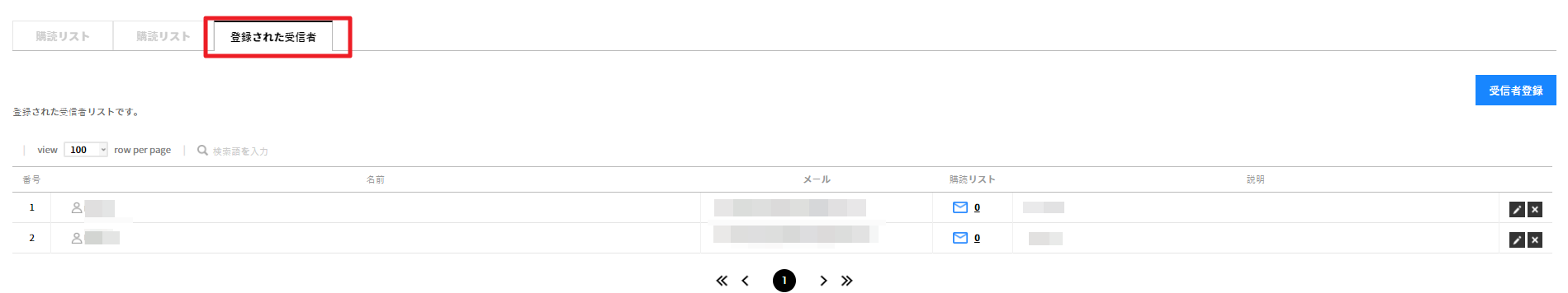- 修正/削除ボタン:クリック時、ポップアップで該当受信者の名前、説明情報を修正したり受信者の情報を削除できます。受信者削除時、該当受信者が受信していた購読情報も共に削除されるため、これ以上メールは送信されません。