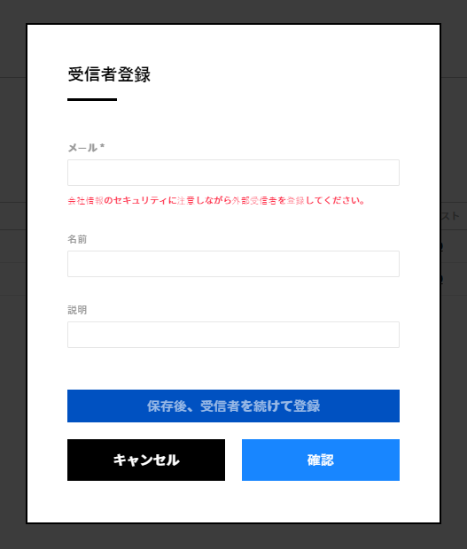 [メール]、[名前]、[説明]などの情報を入力して外部メールアドレスを受信者に登録できます。複数人の受信者を登録する場合、情報を入力してから[保存後、受信者を続けて登録]ボタンをクリックすると、受信者を登録してもポップアップが閉じないため、続けて受信者登録ができます。![]()