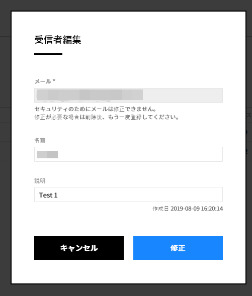 リストで[受信者登録]アイコンをクリックすると、受信者の情報を編集できます。[名前]と[説明]項目に対する修正が可能で[メール]項目は修正できません。