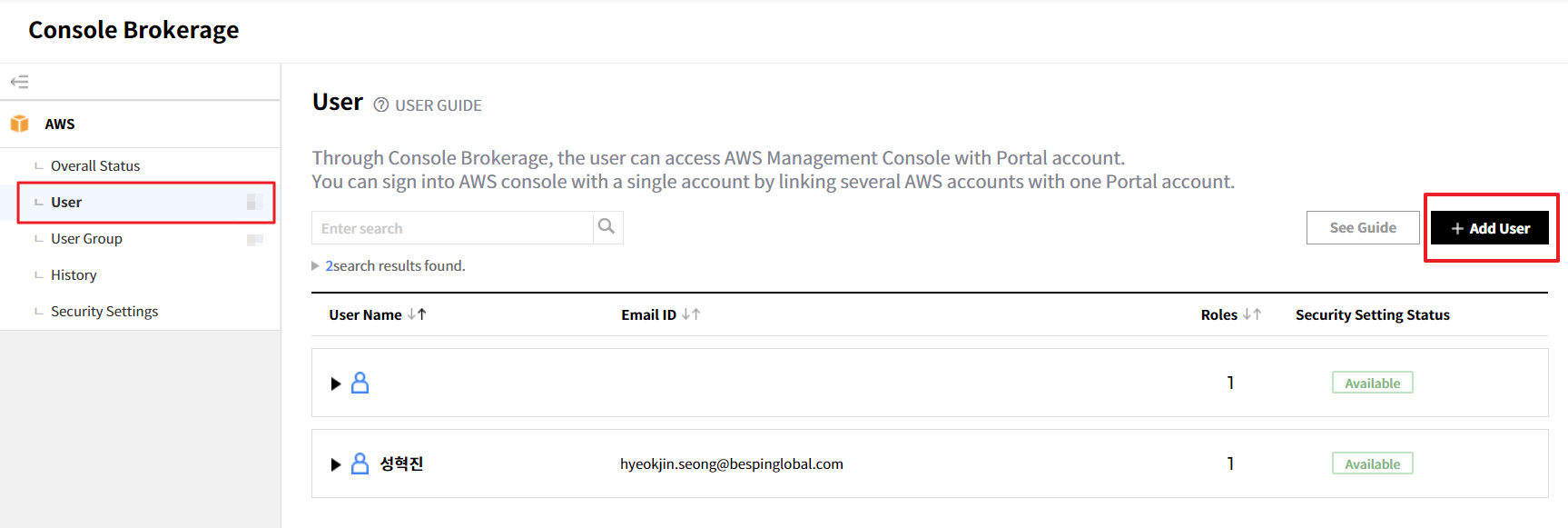 Create a user group by user types and invite users who can use the service. You can assign permissions to services by user groups, and easily manage users by user groups.